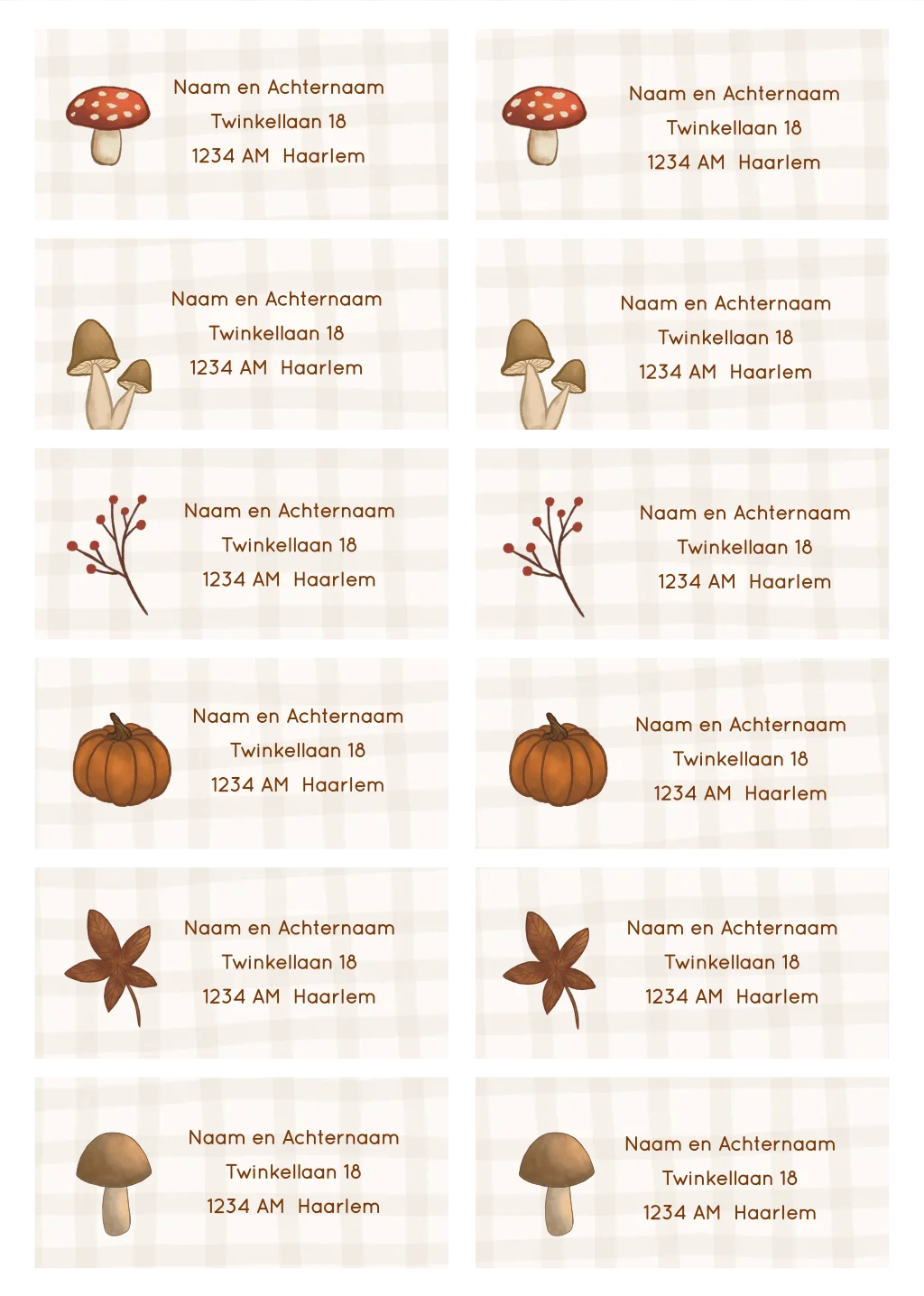Unieke adresstickers in herfst thema. Pas het gemakkelijk aan in de editor.