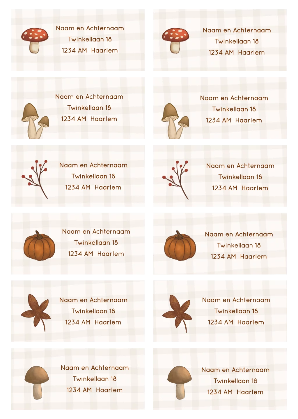 Unieke adresstickers in herfst thema. Pas het gemakkelijk aan in de editor.