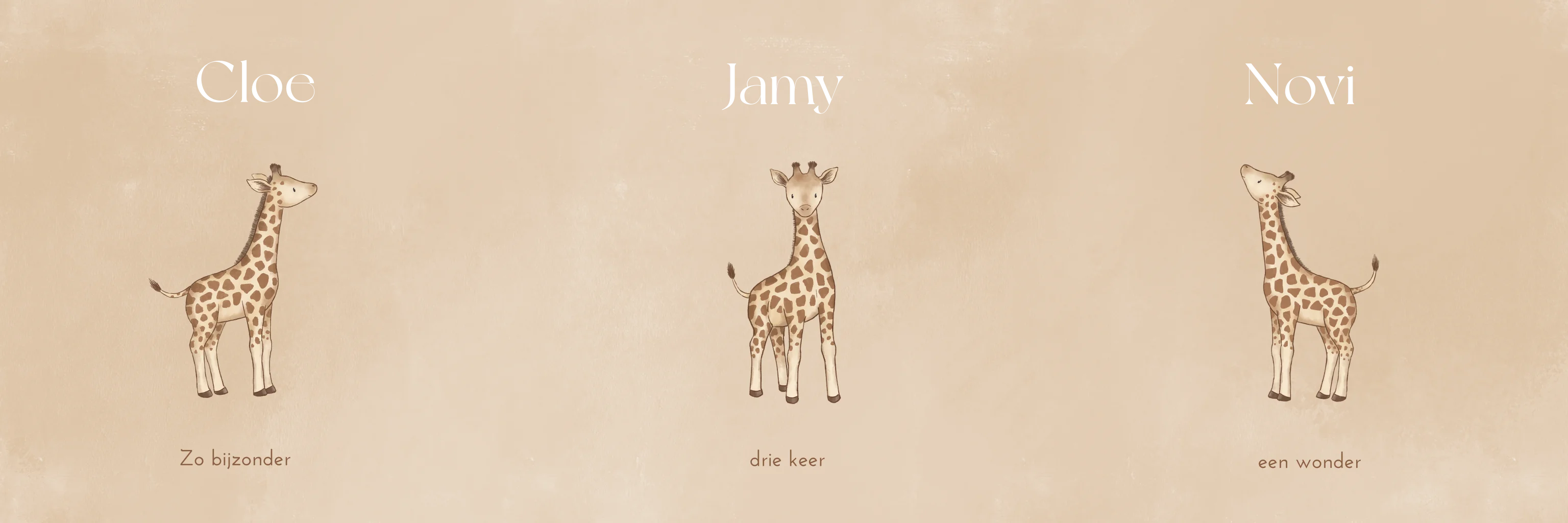 Een vrolijk drieluik geboortekaartje voor een drieling. Ieder kindje heeft zo een eigen gedeelte op de geboorteaankondiging. Een schattig ontwerp met drie baby girafjes. De namen zijn in glinsterend goudfolie. Pas het ontwerp naar wens aan in onze online editor.