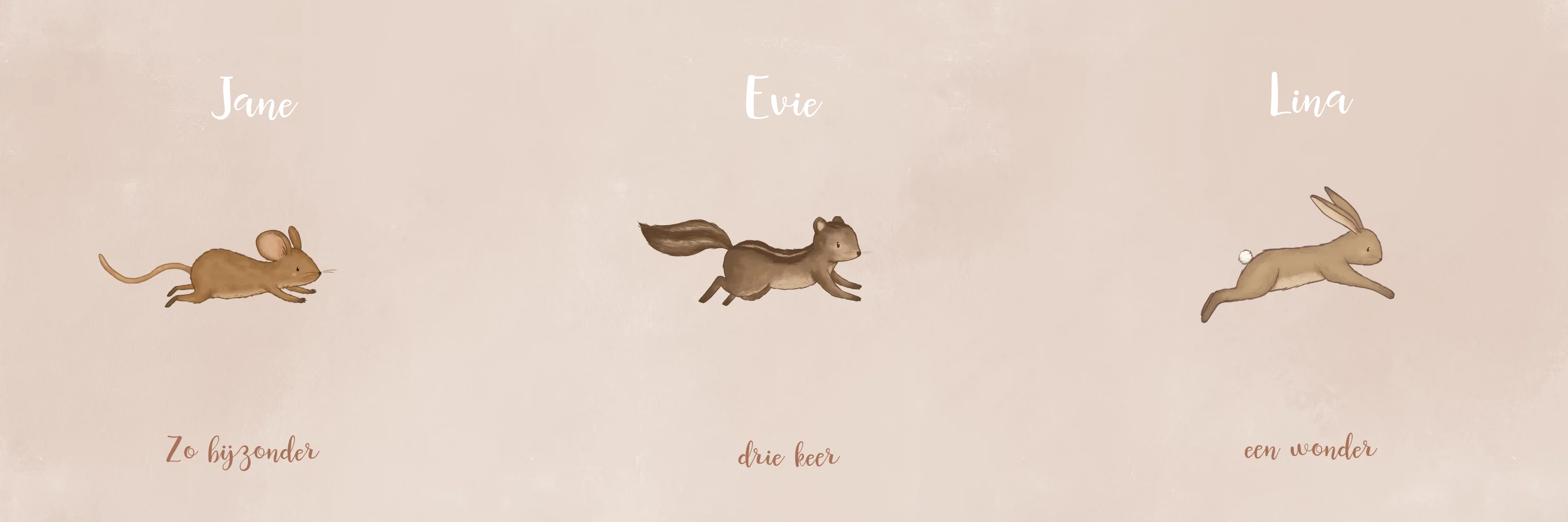 Een vrolijk drieluik geboortekaartje voor een drieling. Ieder kindje heeft zo een eigen gedeelte op de geboorteaankondiging. Een vrolijk ontwerp met springende bosdiertjes en namen in glinsterend goudfolie. Pas het ontwerp naar wens aan in onze online editor.