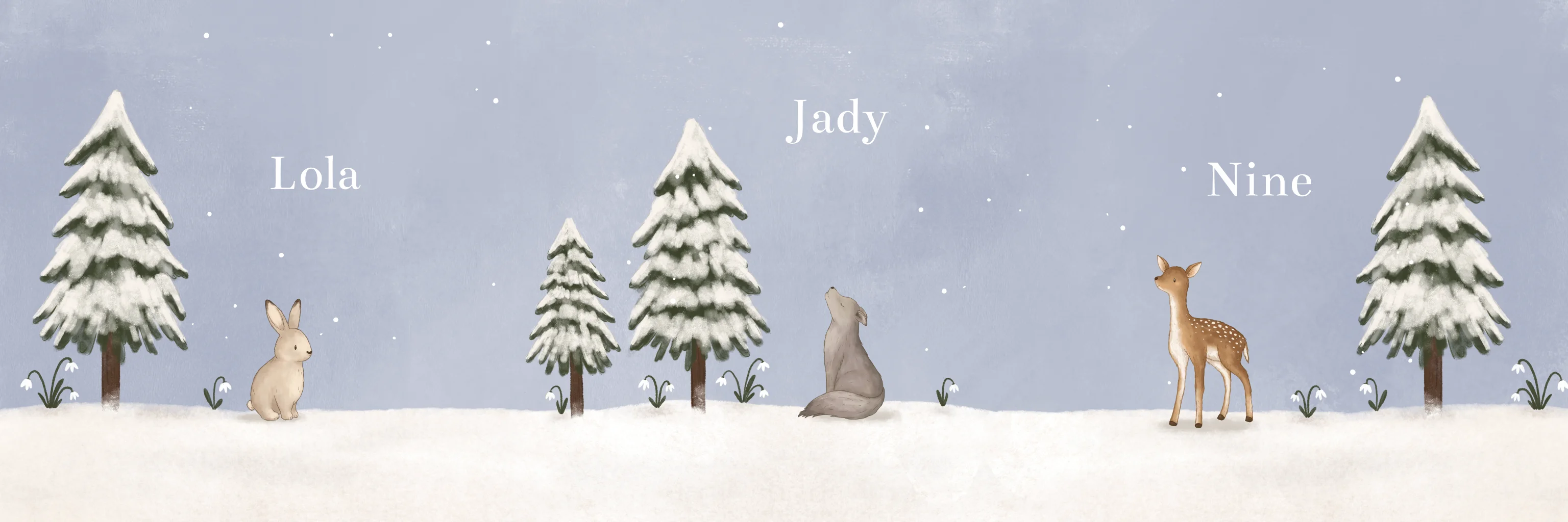 Een uniek drieluik geboortekaartje met een winterlandschap voor jullie drieling! Ieder kindje heeft zo een eigen gedeelte op de geboorteaankondiging. Op het kaartje staan lieve illustraties van een konijntje, wolfje en hertje tussen de besneeuwde bomen. Pas het ontwerp gemakkelijk aan in onze editor.