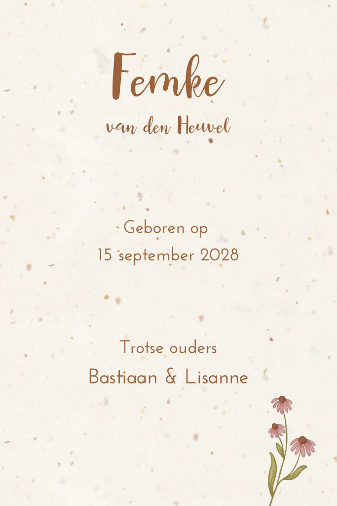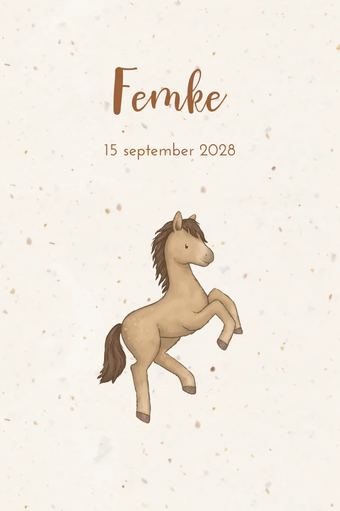Origineel geboortekaartje met een vrolijk veulentje. Dit kaartje wordt gedrukt op prachtig duurzaam papier gemaakt met restafval van tulpenbollen. De vezeltjes in het papier zorgen voor een speelse uitstraling.