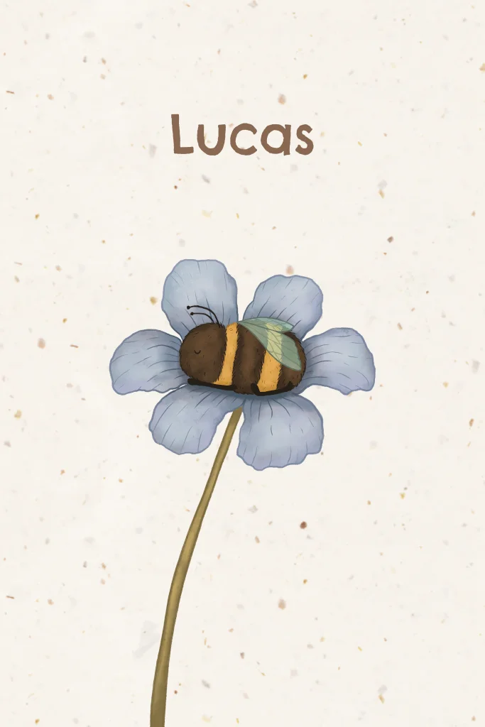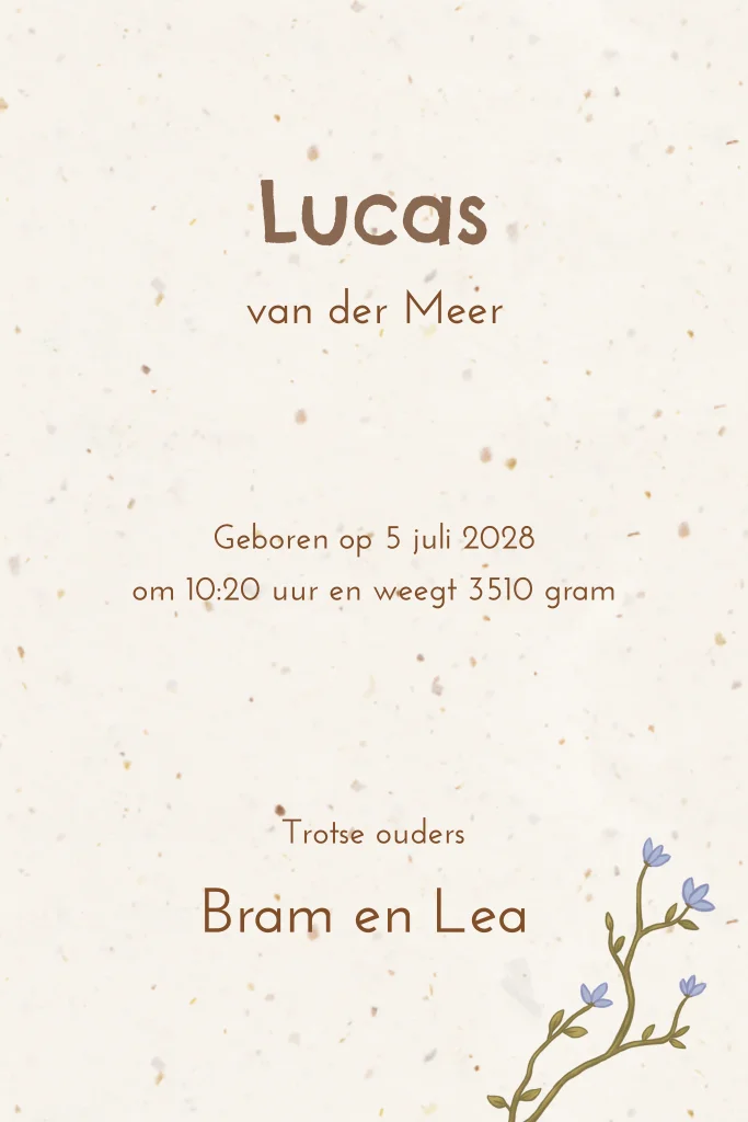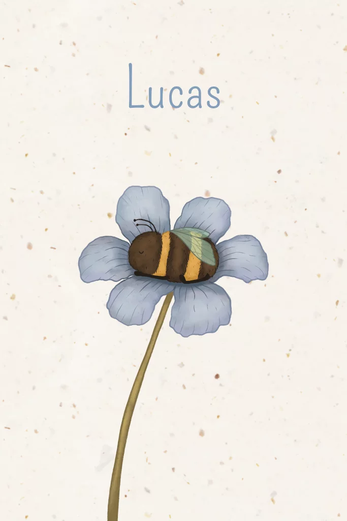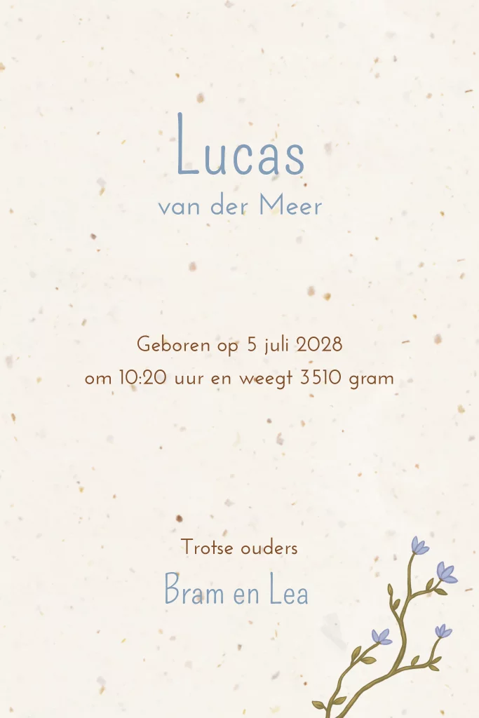 Lief geboortekaartje met een illustratie van een bij in een blauw bloemetje. Uniek kaartje van duurzaam papier, gemaakt van tulpenbollen. De vezeltjes in het papier zorgen voor een speelse uitstraling! Eenvoudig aan te passen in onze online editor.