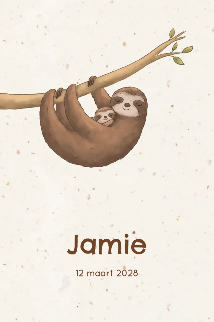 Geboortekaartje met moeder luiaard en baby luiaard. Uniek kaartje van duurzaam papier gemaakt van tulpenbollen. De spikkeltjes in het papier zorgen voor een speelse uitstraling!