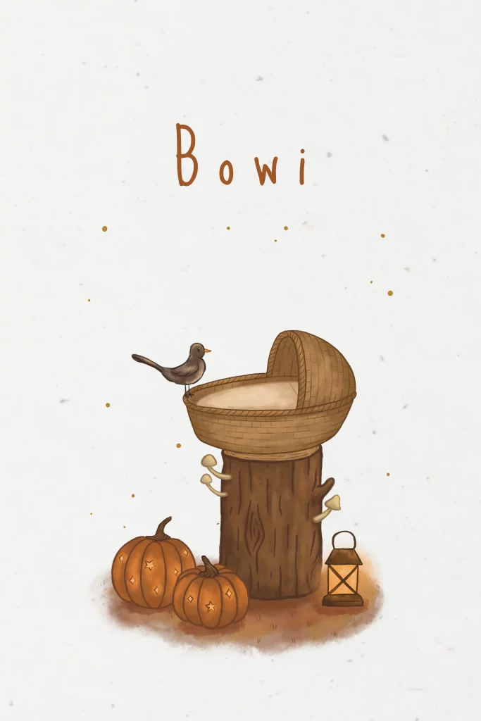 Een lief geboortekaartje in herfst thema. Op het kaartje staat een wiegje in het bos waar een vogeltjes bij zit. De pompoentjes en het lampje geven het kaartje een warme knusse uitstraling. Dit unieke kaartje wordt gedrukt op duurzaam papier. De vezeltjes in het papier zorgen voor een speelse en vintage uitstraling! Pas het kaartje eenvoudig aan in onze online editor.