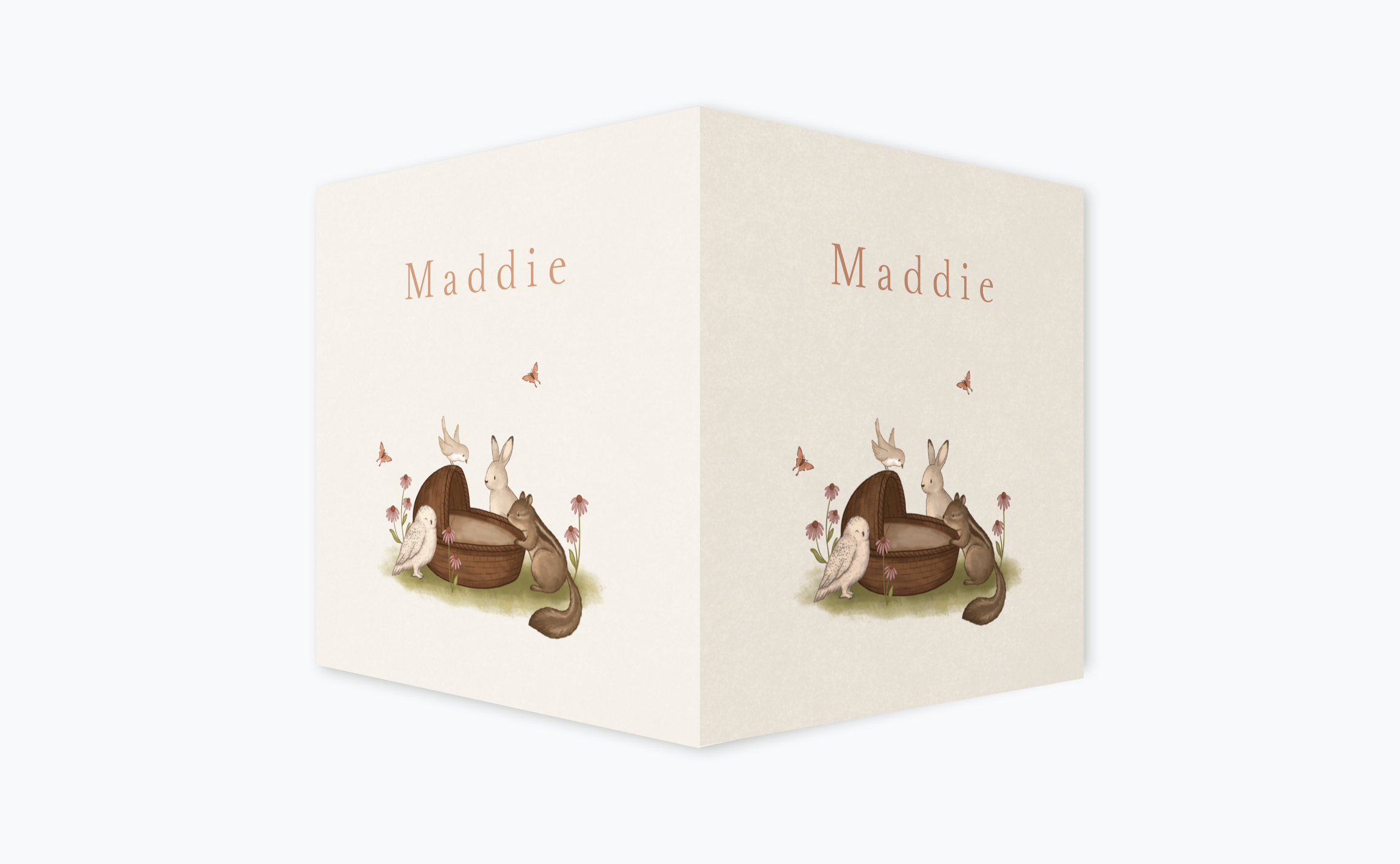 Maak de geboorte van je kindje bekend met dit leuke dubbele raambord! Een lieve illustratie van bosdieren bij een wiegje. Pas het geboorte-raambord eenvoudig aan in de editor.