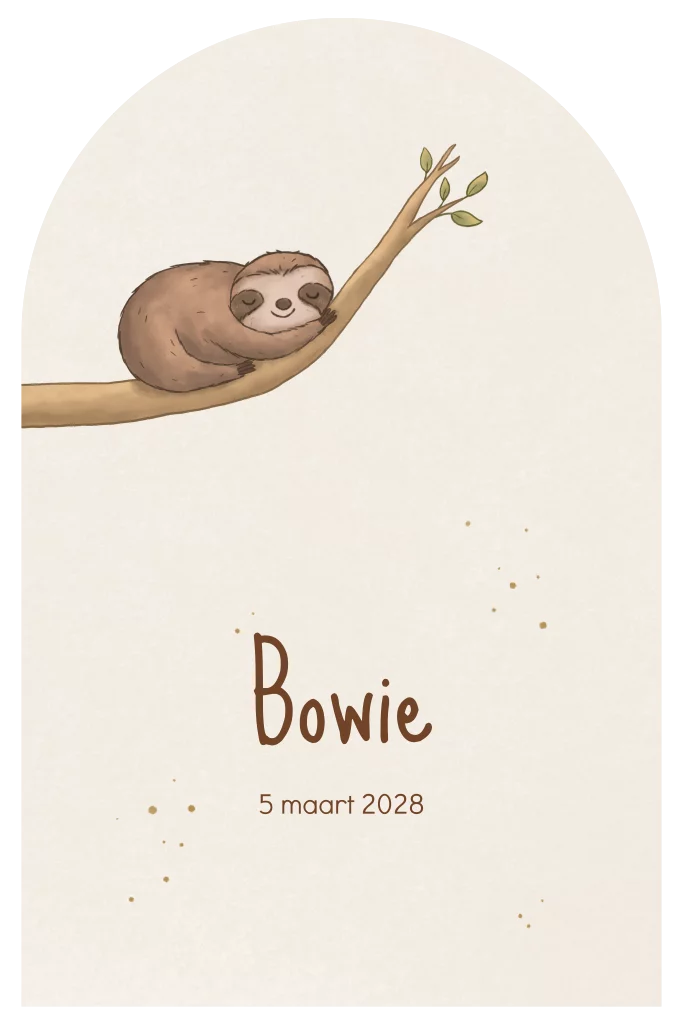 Uniek geboortekaartje in boogvorm met een slapende baby luiaard.