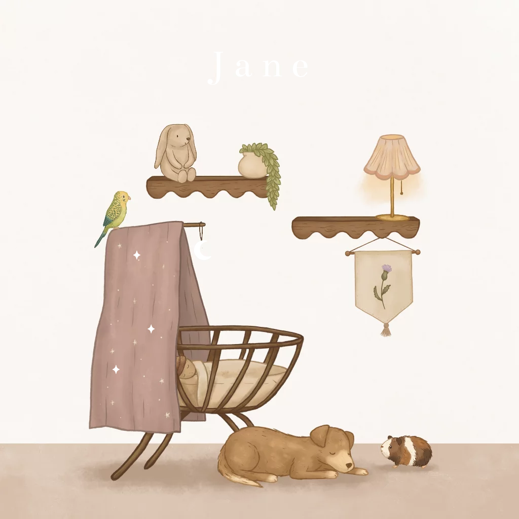 Geboortekaartje van een babykamer met huisdieren. Liever een ander wiegje of andere decoratie aan de muur? Pas het ontwerp gemakkelijk aan in de editor! Wil je een echt persoonlijk kaartje? Neem contact met ons op, wij maken graag een illustratie op maat van jouw huisdieren of speciaal knuffeltje.