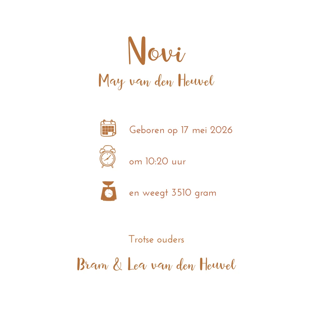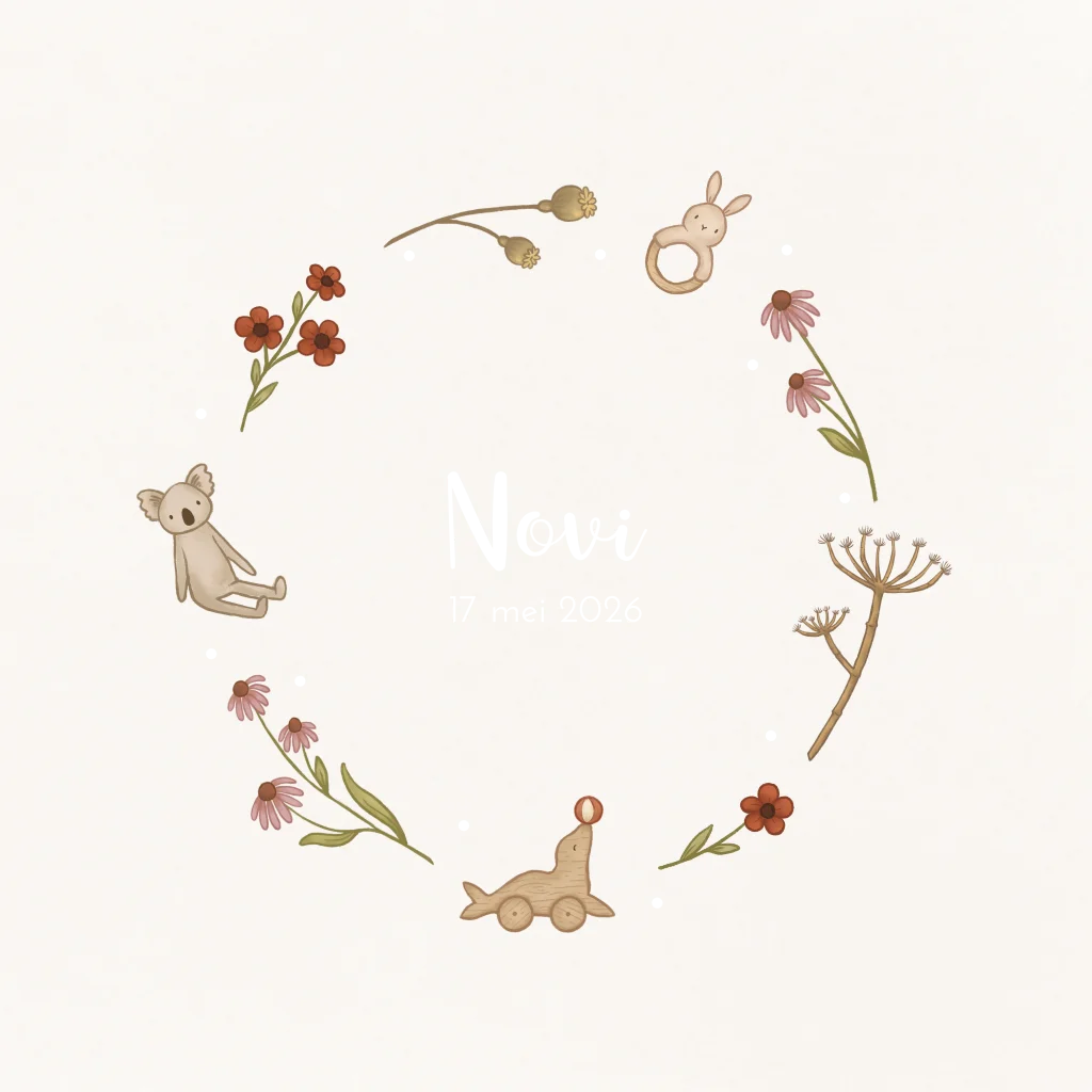 Lief geboortekaartje met een bloemenkrans en schattige knuffeltjes. Pas de bloemetjes gemakkelijk aan in de editor. Zit jouw favoriete knuffeltje of speelgoed niet in de editor? Neem contact met ons op, wij maken graag een illustratie op maat.