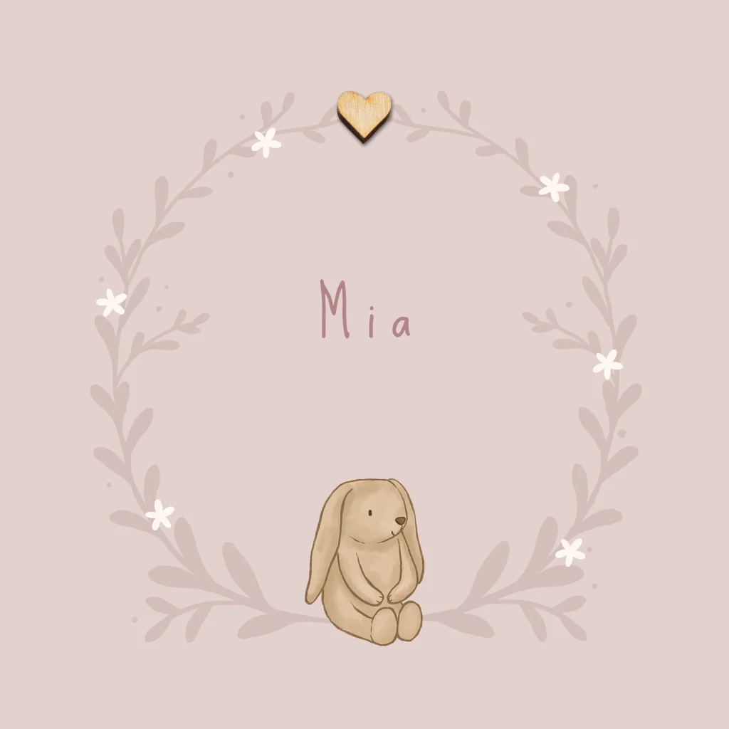 Een schattig geboortekaartje met een konijn knuffeltje in een krans met bloemetjes. De oudroze achtergrond zorgt voor een warm en lief geheel. Maak het kaartje af met een houten hartje, deze kun je gemakkelijk zelf toevoegen tijdens het bestelproces.