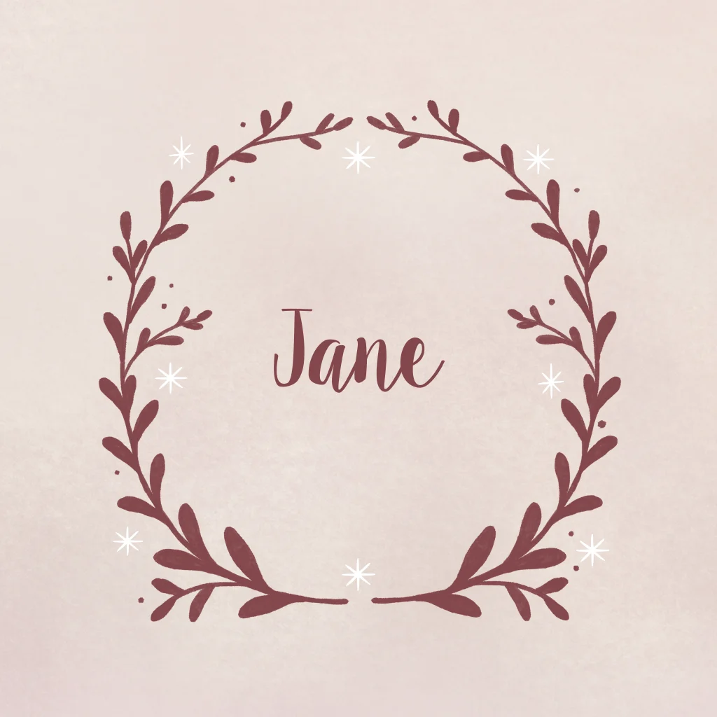 Een winters geboortekaartje met een rode krans. De roze achtergrond en witte sterretjes geeft het kaartje een lieve uitstraling.