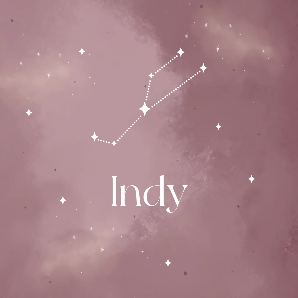 Een magische geboortekaartje met een paarse sterrenhemel. De naam, sterren en sterrenbeeld zijn afgewerkt in een roségoudfolie. Pas het kaartje aan in onze online editor.