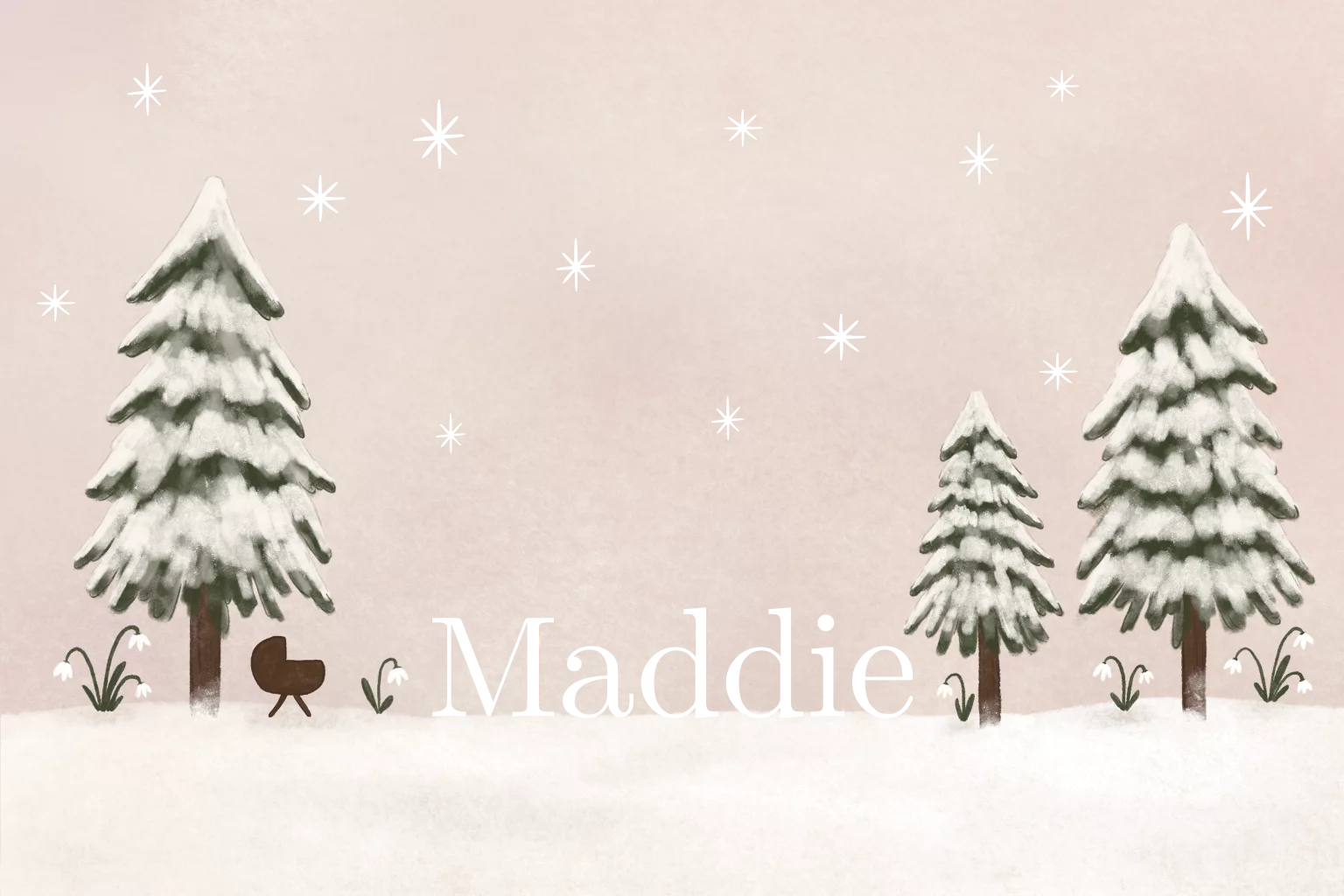 Een lief winters geboortekaartje met een sneeuwlandschap. De sneeuwklokjes komen net boven de sneeuw uit.