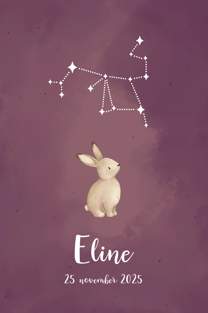 Geboortekaartje met sterrenbeeld en een konijntje. De achtergrond van het kaartje heeft een diepe paarse kleur. Het sterrenbeeld en de naam is afgewerkt in goudfolie.