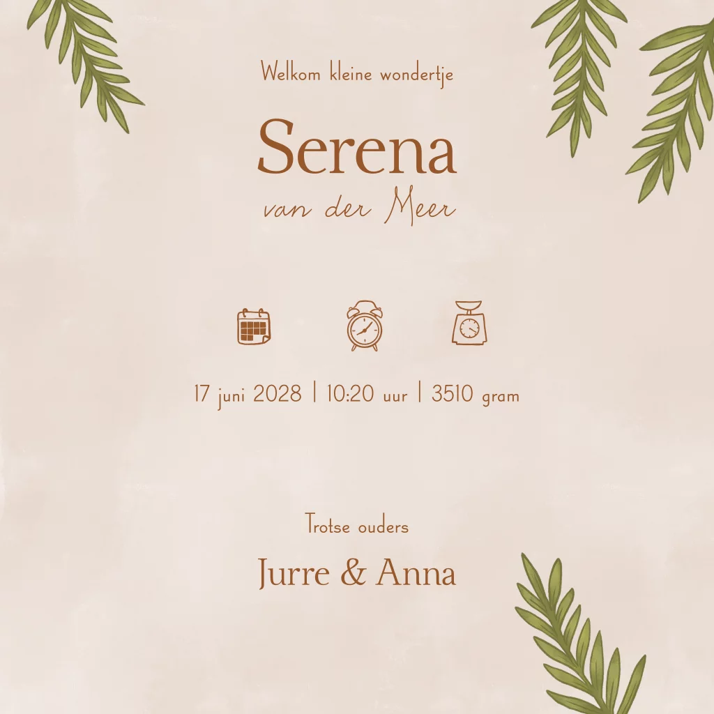 Een lief, tropisch geboortekaartje met een toekan. Maak het kaartje af met een houten maantje, deze kun je gemakkelijk zelf toevoegen tijdens het bestelproces.
