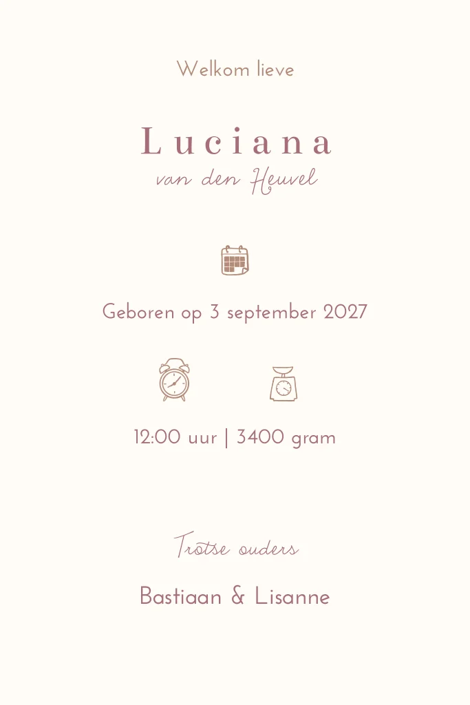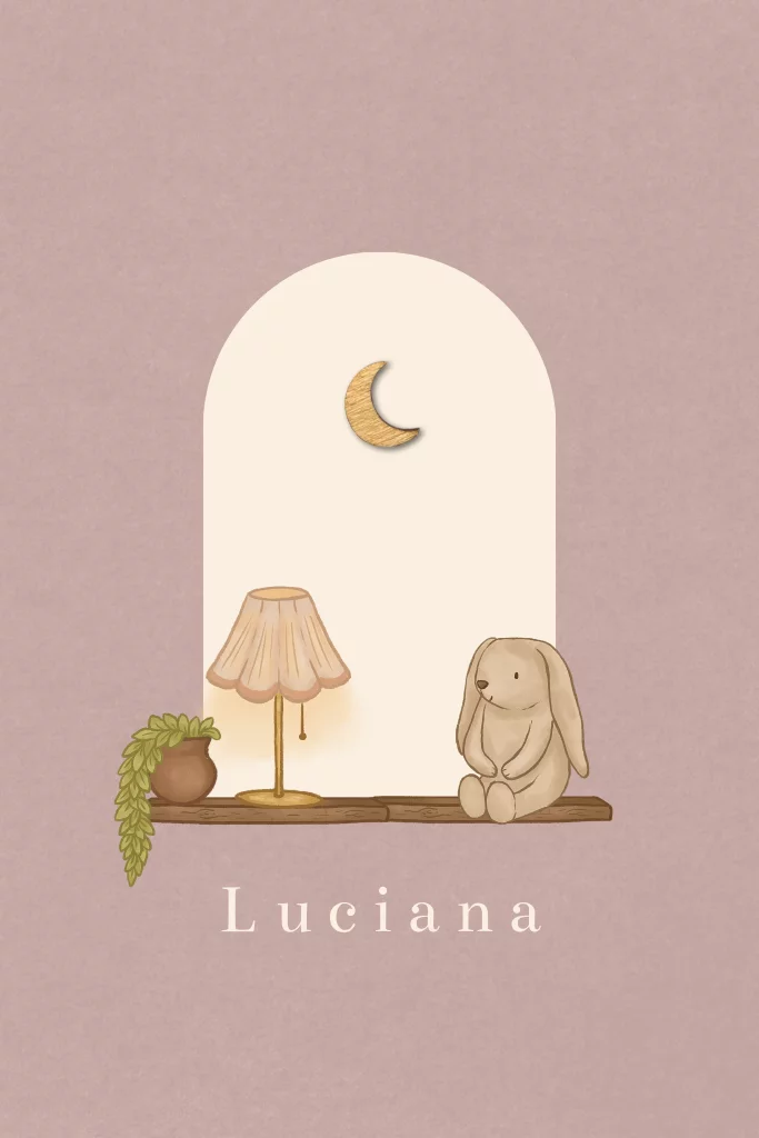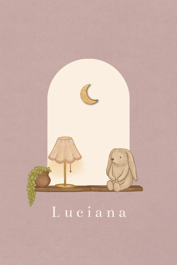 Een lief geboortekaartje met een venster. Op het plankje zit een konijnen knuffeltje en staat een lampje en een plantje. Pas deze elementjes makkelijk aan in de editor. Maak het kaartje af met een houten maantje, deze kun je gemakkelijk zelf toevoegen tijdens het bestelproces.