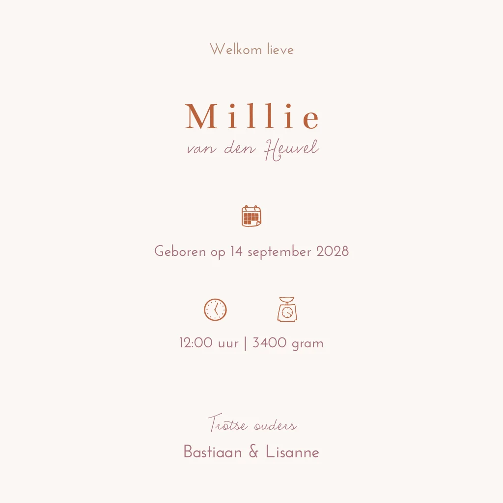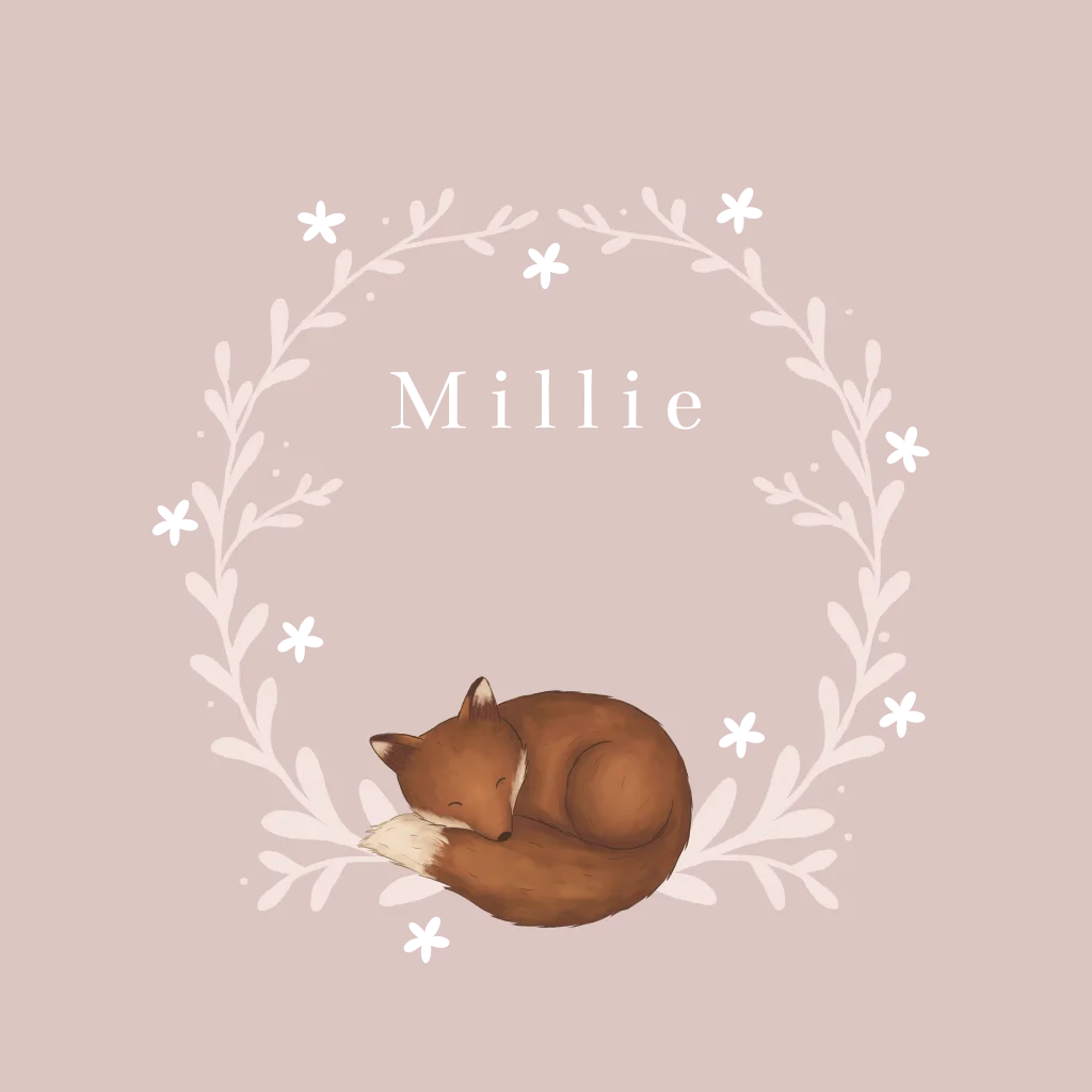 Een lief geboortekaartje met een vosje in een krans. De prachtige roze kleur op de achtergrond zorgt voor warm geheel. De naam en bloemetjes zijn in koperfolie, wat voor een luxe en twinkelende uitstraling zorgt.