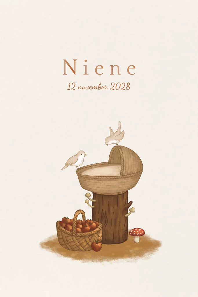 Een lief geboortekaartje met een wiegje in het bos waar twee vogeltjes bij zitten. De herfstige tinten geven dit kaartje een warme uitstraling. De naam is in afgewerkt in een prachtige kopere hoogglans kleur. Pas het kaartje eenvoudig aan in onze online editor.