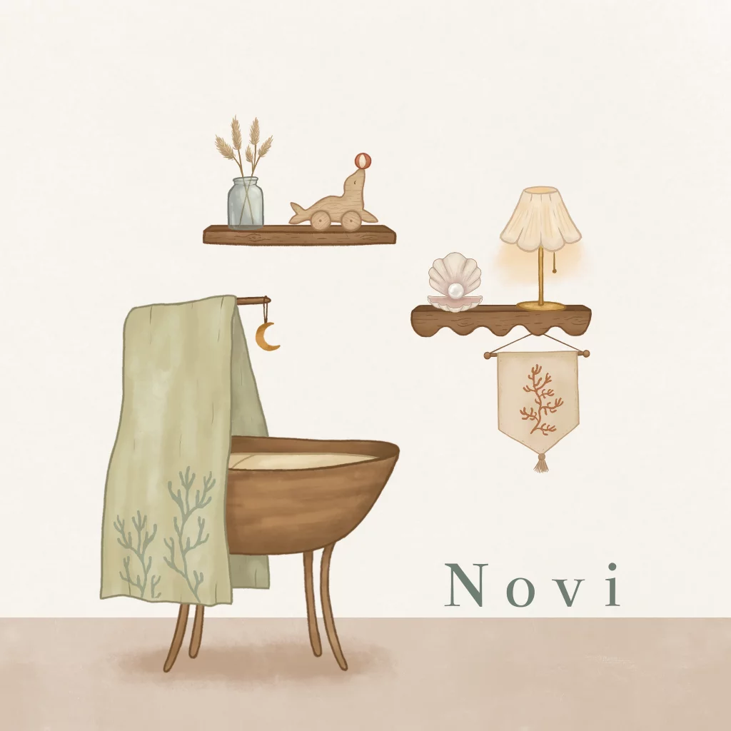 Geboortekaartje van een babykamer in zeethema. Liever een ander wiegje of andere decoratie aan de muur? Pas het ontwerp gemakkelijk aan in de editor! Wil je een echt persoonlijk kaartje? Neem contact met ons op, wij maken graag een illustratie op maat van bijvoorbeeld jouw huisdieren of speciaal knuffeltje.