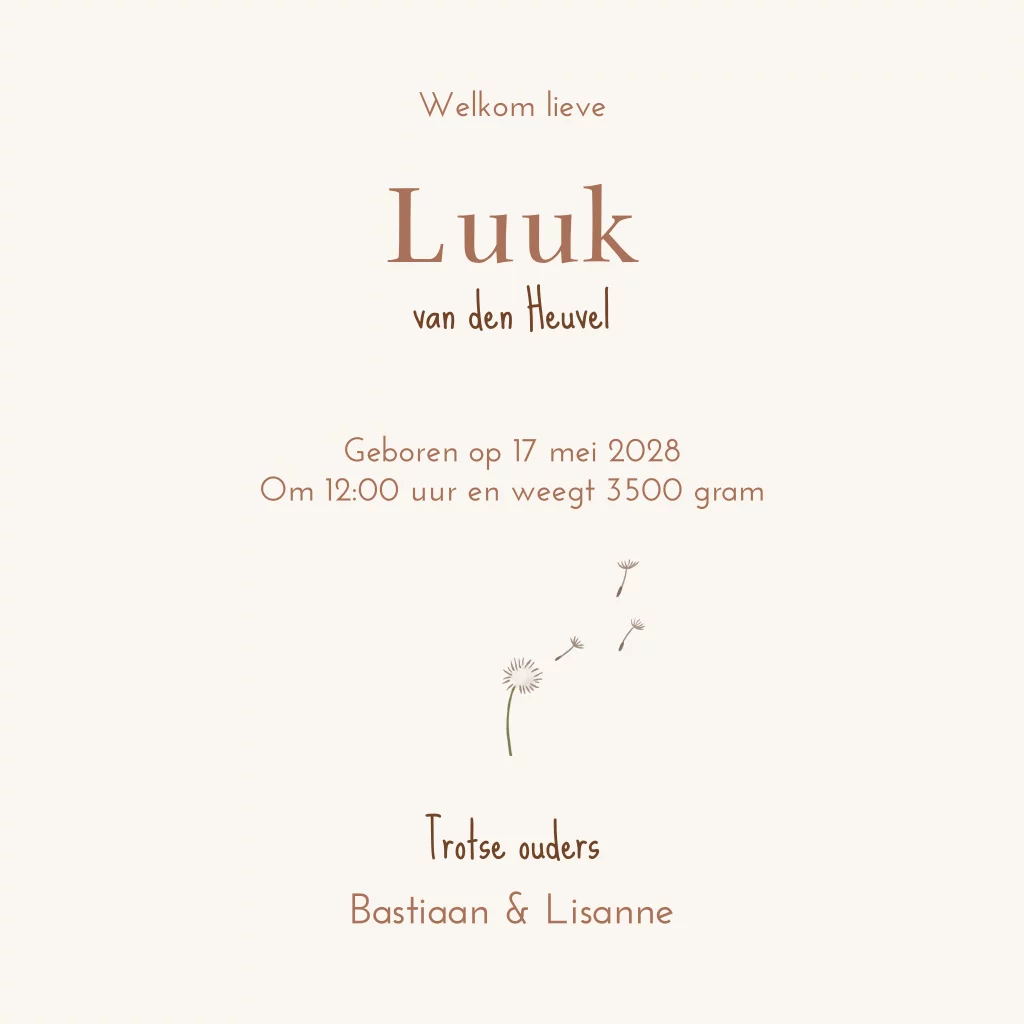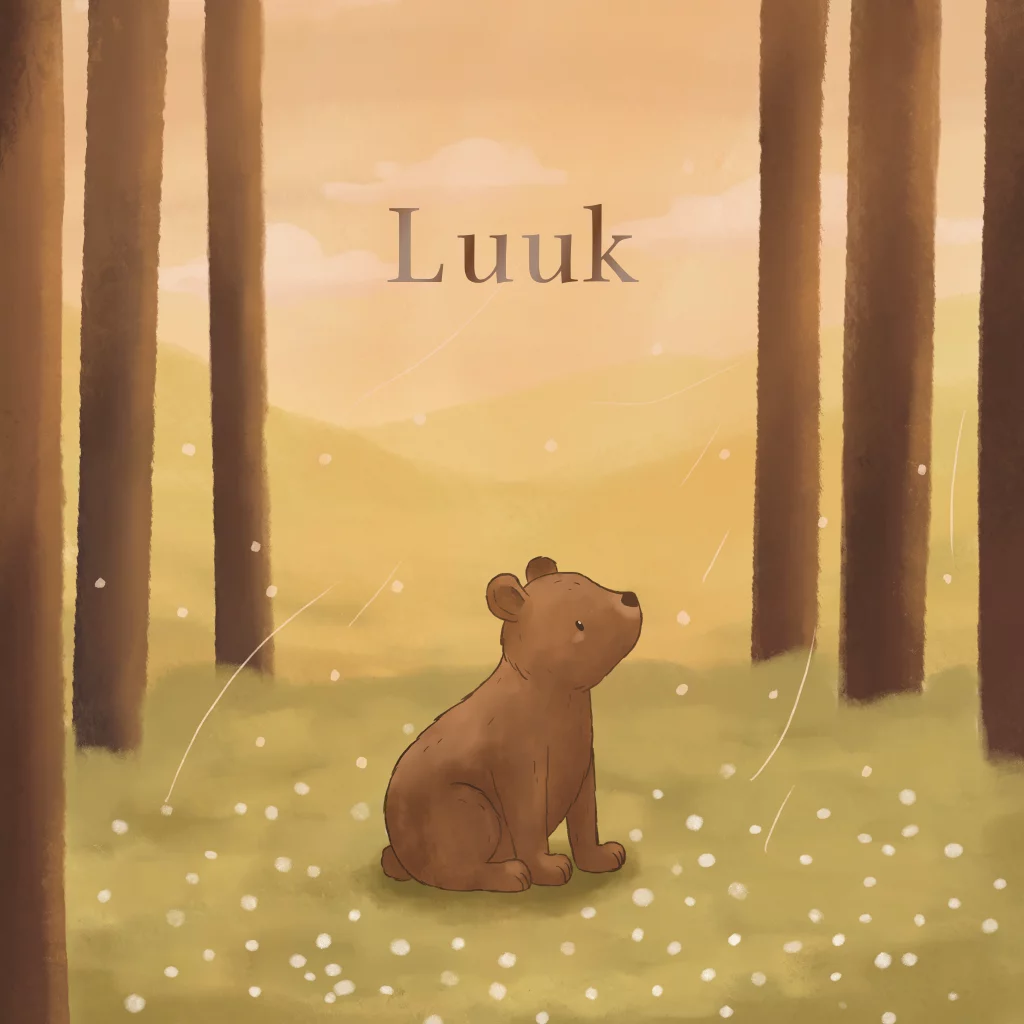 Geboortekaartje met een lieve illustratie van een beertje die in het bos zit tussen de pluizenbollen. Het avondzonnetje, in combinatie met de rond dwarrelende pluisjes, geeft het kaartje een warme en dromerig uitstraling. De naam is afgewerkt in een donkerbruine hooglans. Pas het kaartje eenvoudig aan in de online editor.