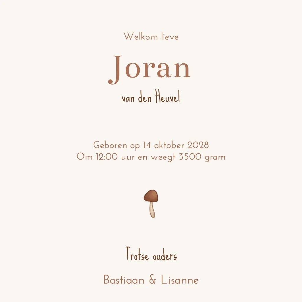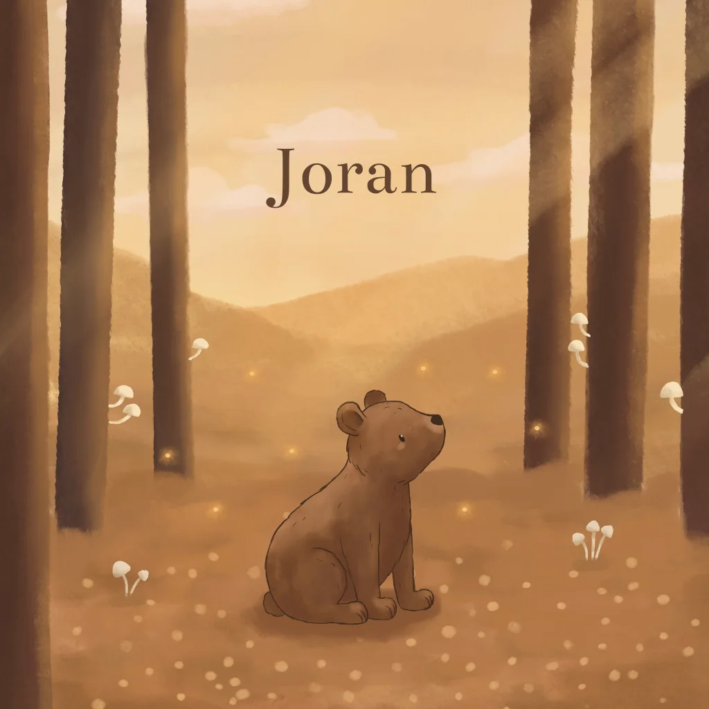 Geboortekaartje met een lieve illustratie van een beertje in een bos met prachtige warme herfstkleuren. Het avondzonnetje, in combinatie met de vuurvliegjes, geeft het kaartje een dromerig uitstraling. Pas het kaartje eenvoudig aan in de online editor.