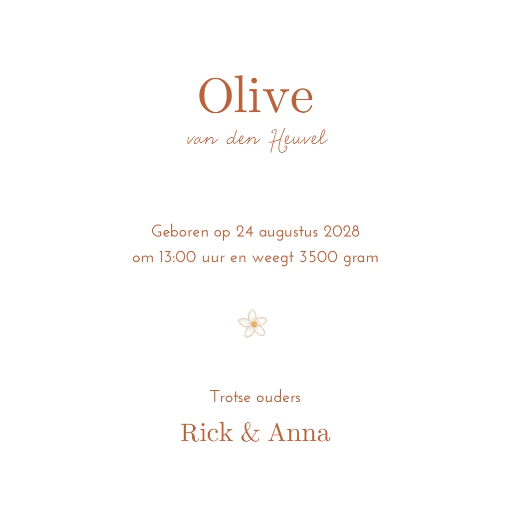 Kondig de geboorte van jullie kleintje aan met dit lieve geboortekaartje! Op het kaartje staat een illustratie van een klein eendje en een bloemetjes patroon. De beige kleur op de achtergrond geeft het kaartje een neutrale, warme uitstraling. De naam en de stipjes op de bloemen zijn in koperfolie. Pas het kaartje eenvoudig aan in onze online editor.