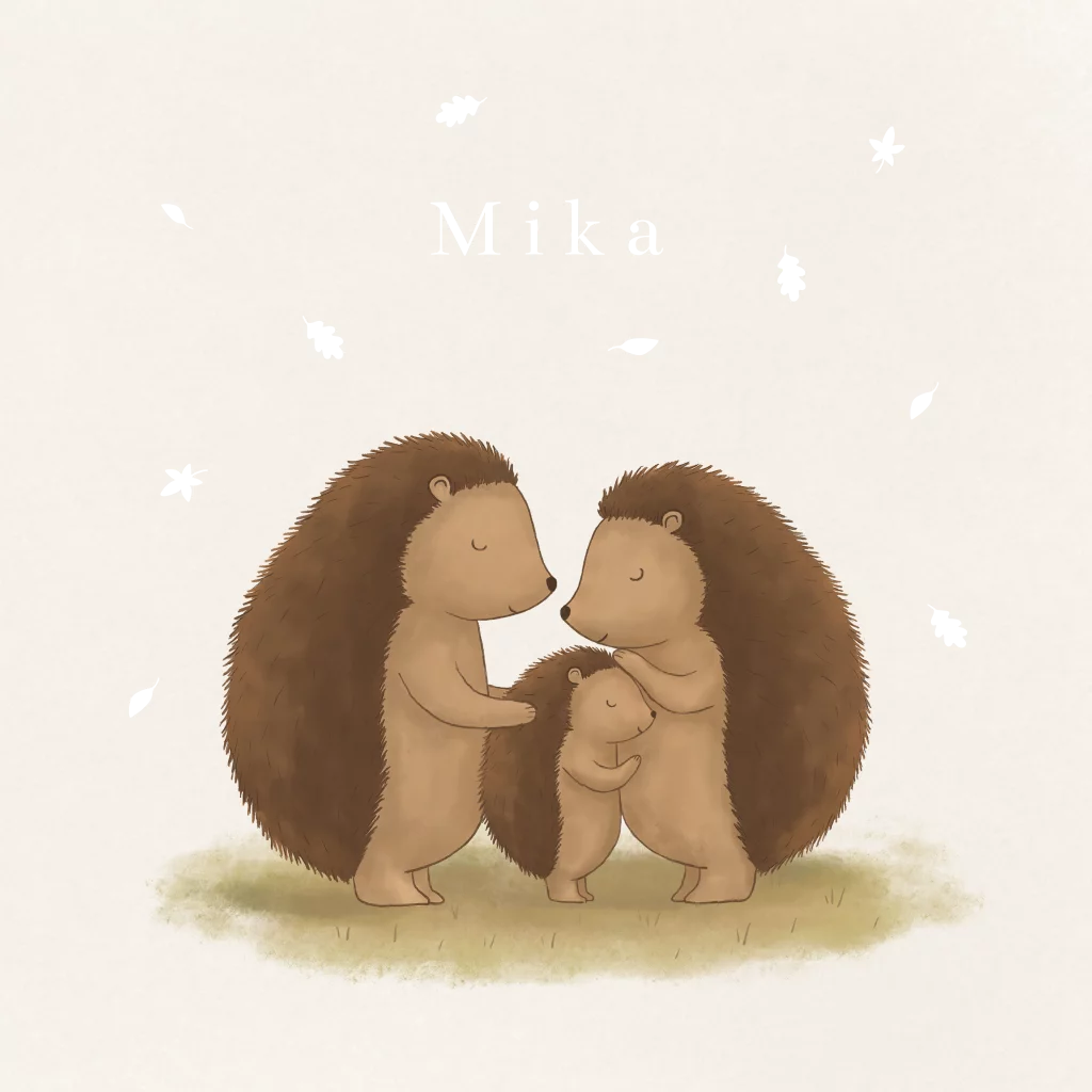 Een lief geboortekaartje met een baby egeltje die wordt geknuffeld door papa en mama egel. De dwarrelende blaadjes zijn afgewerkt met glinsterend goudfolie. Pas het kaartje gemakkelijk aan in de editor.