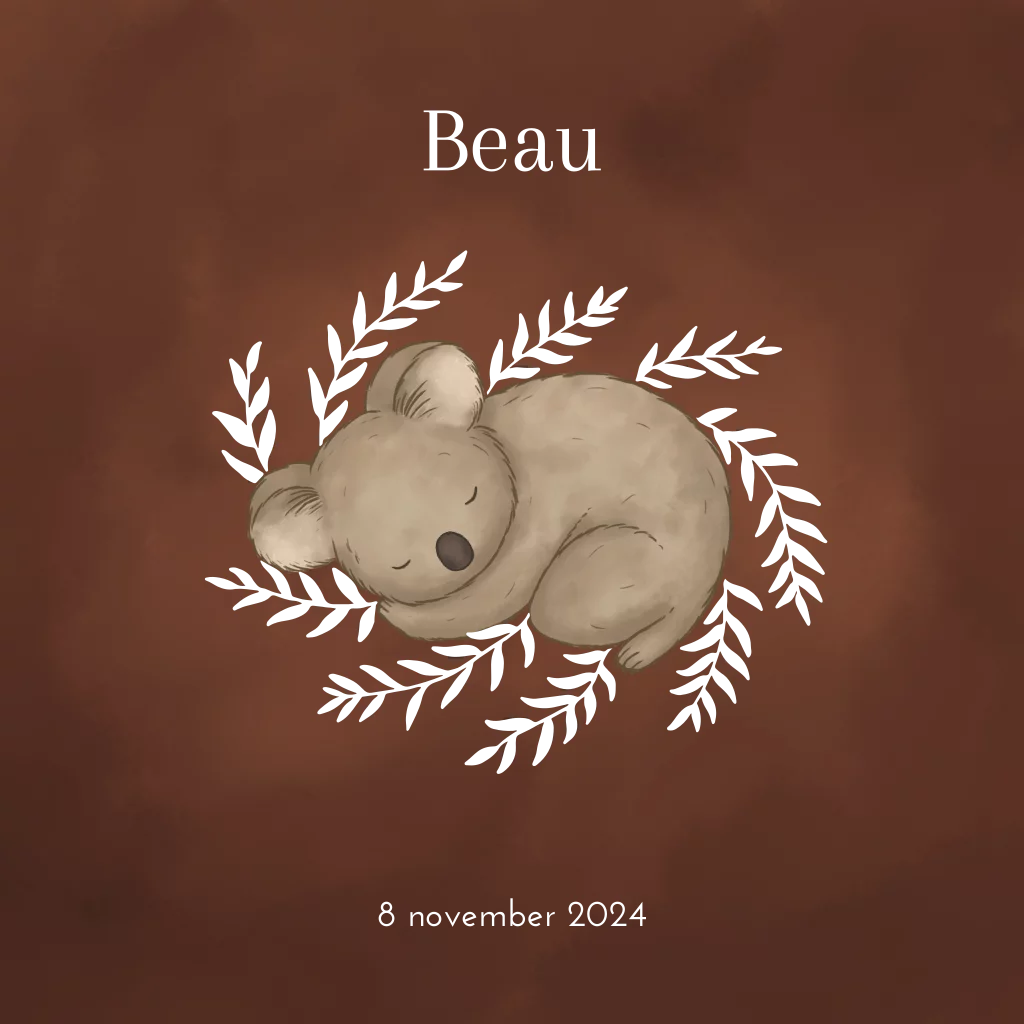 Een luxe en uniek geboortekaartje met een schattige koala. De blaadjes krans is afgewerkt met goudfolie. De achtergrond van het kaartje heeft een mooie roest kleur, wat zorgt voor een warme sfeer.