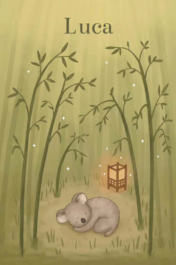 Geboortekaartje met een koala slapend in een sprookjesachtig bamboe bos. De sterretjes in goudfolie zijn net fonkelende vuurvliegjes. Samen met het Japanse lampje geeft dit het kaartje een dromerige uitstraling.