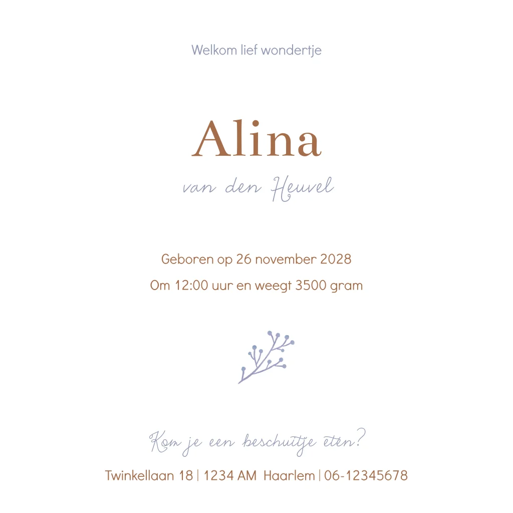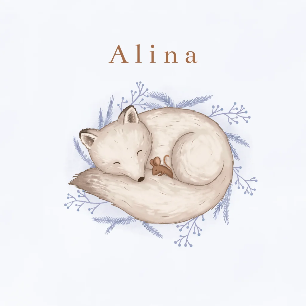 Een lief, winters geboortekaartje met een slapende vos en een muisje. Pas dit knusse, warme geboortekaartje eenvoudig aan in onze online editor!