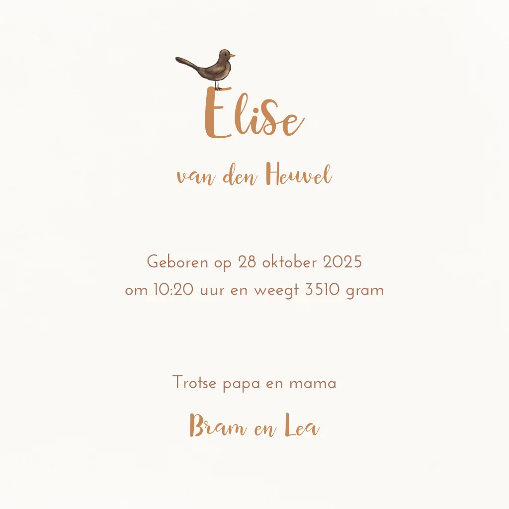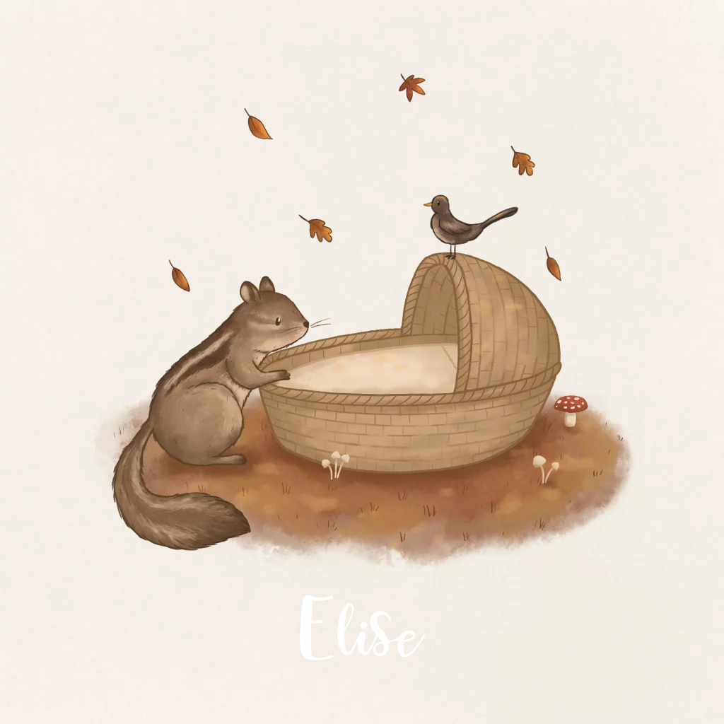 Een sfeervol herfst geboortekaartje van een wiegje met een eekhoorntje erbij. De dwarrelende herfstblaadjes en kleine paddenstoeltjes geven het kaartje een lieve en warme uitstraling. De naam is in schitterende goudfolie. Pas het ontwerp naar wens aan in onze editor.