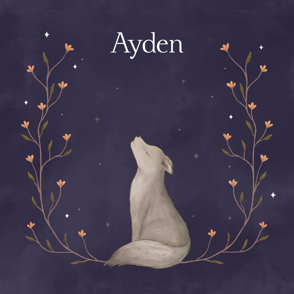 Een uniek en magisch geboortekaartje met een wolfje. De bloementjes op de diepblauwe achtergrond geeft het kaartje een folklore uitstraling. De naam en sterretjes zijn afgewerkt met holografisch folie Pas het ontwerp gemakkelijk aan in de editor!