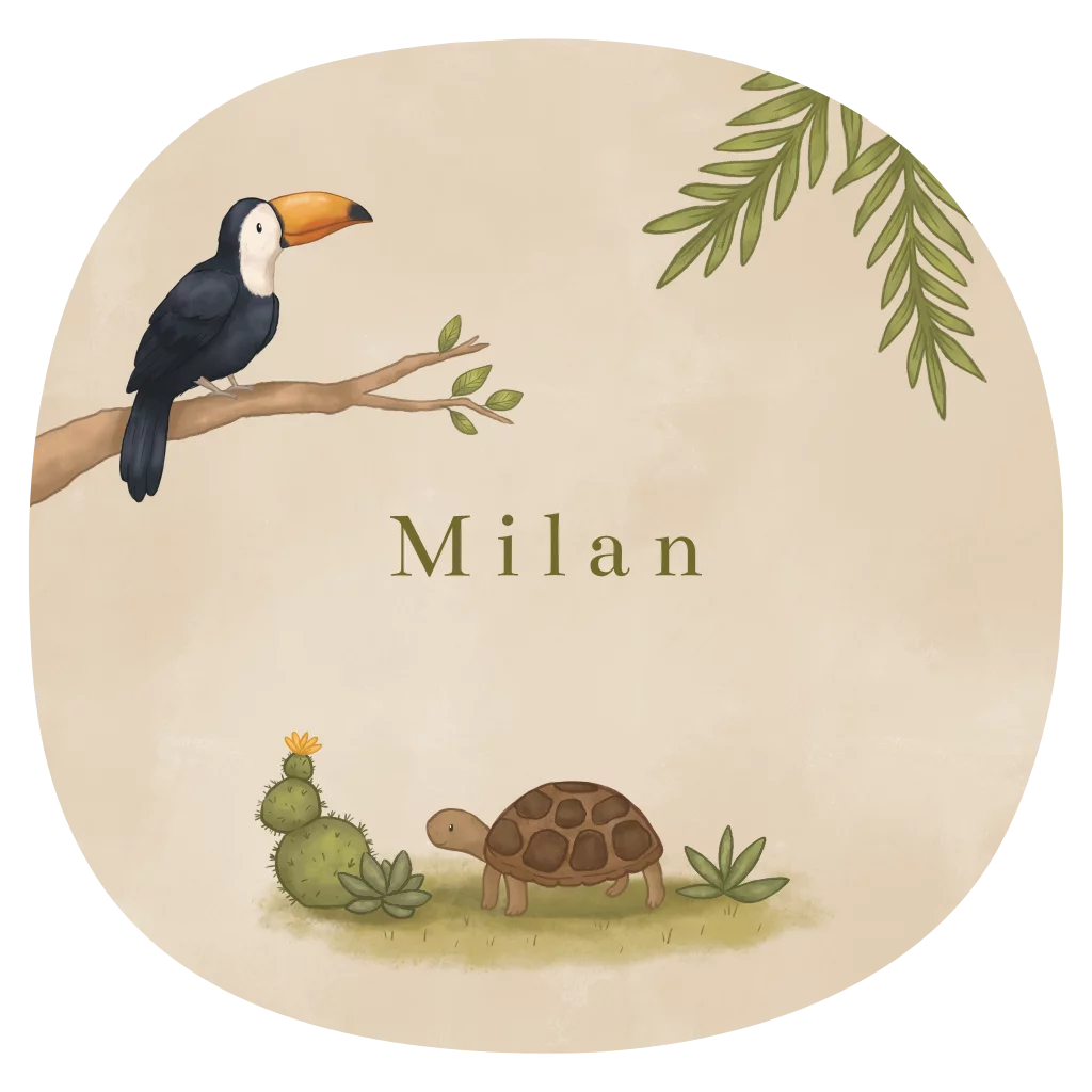 Een schattig geboortekaartje in een ronde vorm met jungledieren. Op het kaartje staan illustraties van een toekan en een schildpad in de jungle. De beige achtergrond zorgt voor een warm en rustig geheel.