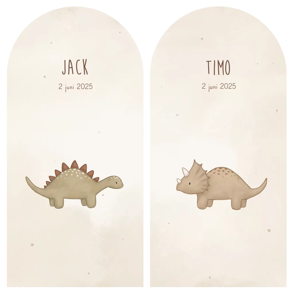 Twee geboortekaartjes die in elkaar passen voor een tweeling. Zo heeft ieder kindje een eigen kaartje. Op de kaartjes staan twee schattige baby dino's. De kaartjes hebben lichte natuurlijke kleuren, wat zorgt voor een rustige uitstraling.