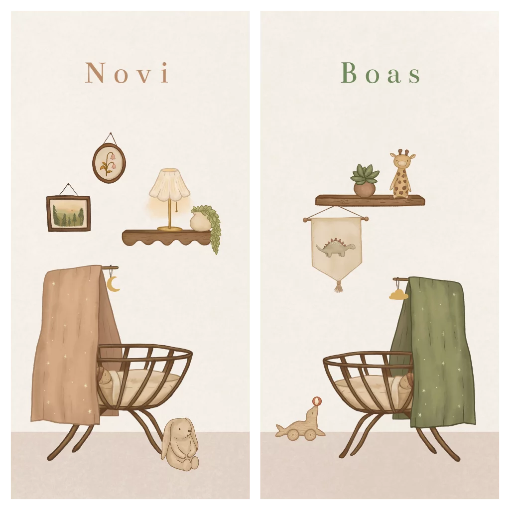 Deze twee losse geboortekaartjes zijn perfect voor als jullie een tweeling krijgen. Samen vormen de kaartjes een babykamer met twee wiegjes. Zo heeft ieder kindje een eigen uniek kaartje.
