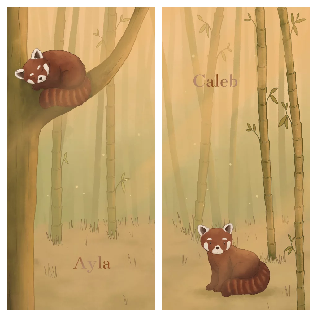 Deze twee geboortekaartjes zijn perfect voor als jullie een tweeling krijgen! Ieder kindje heeft een eigen kaartje, maar de twee kaartjes passen wel bij elkaar. Op de kaartjes staat een illustratie van een bamboe bos met twee rode panda's. Het prachtige avondzonnetje, zorgt voor een warme uitstraling. De namen zijn in hoogglans.