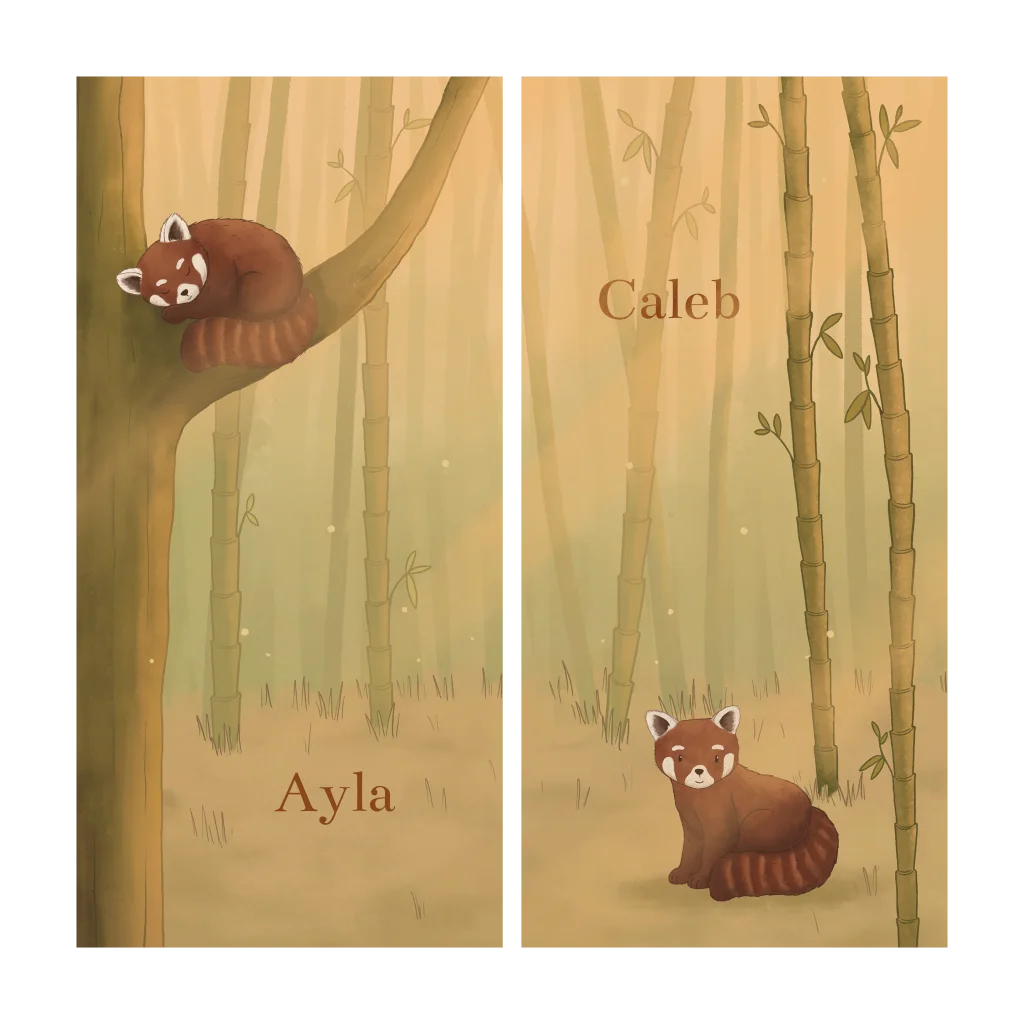 Deze twee geboortekaartjes zijn perfect voor als jullie een tweeling krijgen! Ieder kindje heeft een eigen kaartje, maar de twee kaartjes passen wel bij elkaar. Op de kaartjes staat een illustratie van een bamboe bos met twee rode panda's. Het prachtige avondzonnetje, zorgt voor een warme uitstraling.