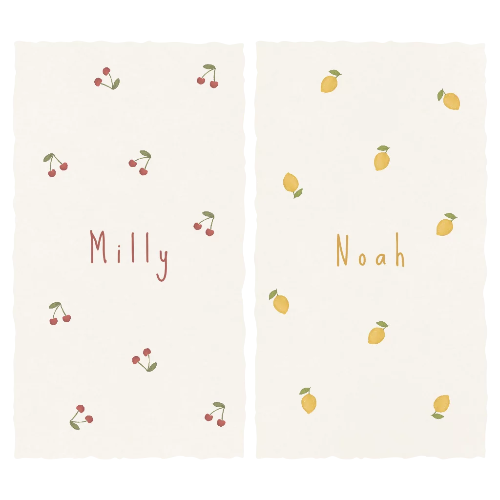 Twee lieve geboortekaartjes voor een tweeling. Ieder kindje heeft zo een eigen kaartje, maar de twee kaartjes passen wel bij elkaar, perfect voor jullie tweeling! De kaartjes hebben een zomers tintje door de kersen en de citroentjes. Kies voor de papiersoort linnen, zo krijgt het kaartje in combinatie met het kartelrandje een handgeschept papier look.
