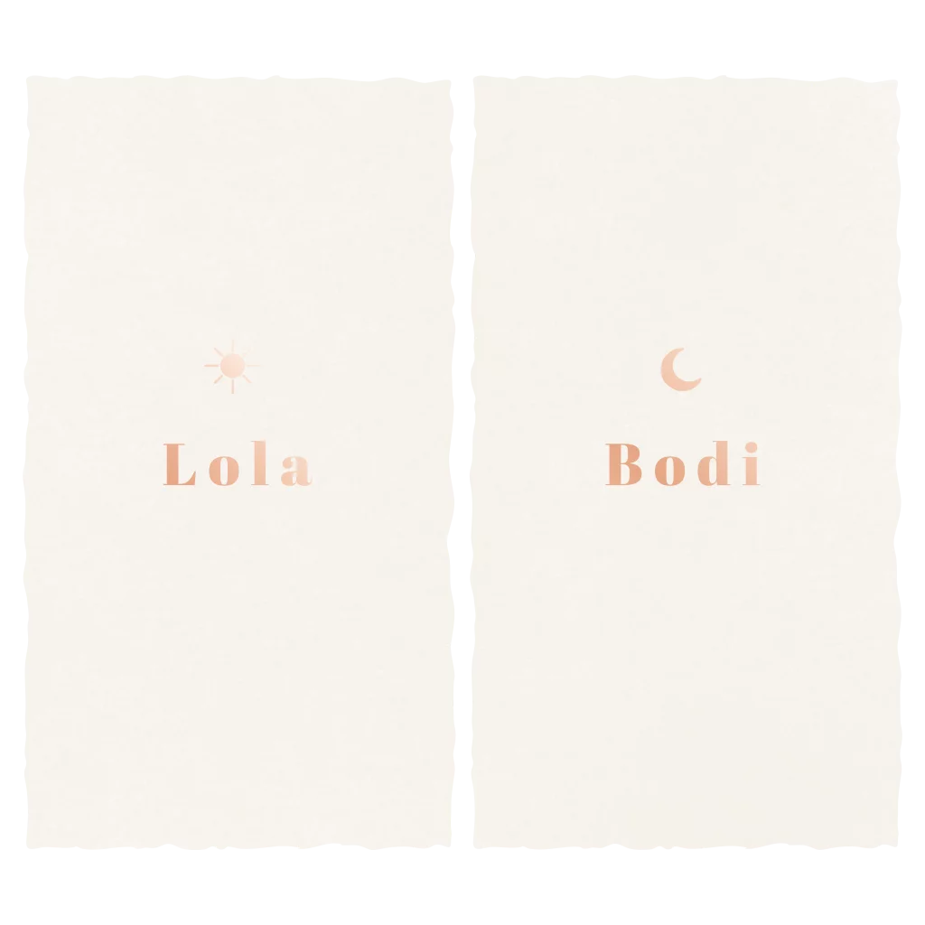 Deze twee kaartjes zijn perfect voor als jullie een tweeling krijgen! Ieder kindje heeft een eigen kaartje, maar de twee kaartjes passen wel bij elkaar. Twee minimalistische kaartjes met een zonnetje en maantje. De namen, het zonnetje en het maantje zijn afgewerkt in schitterende roségoudfolie. De geboortekaartjes hebben een kartelrand wat een geschept papier look geeft. Kies voor de papiersoort linnen, voor een extra handgeschept papier uitstraling!