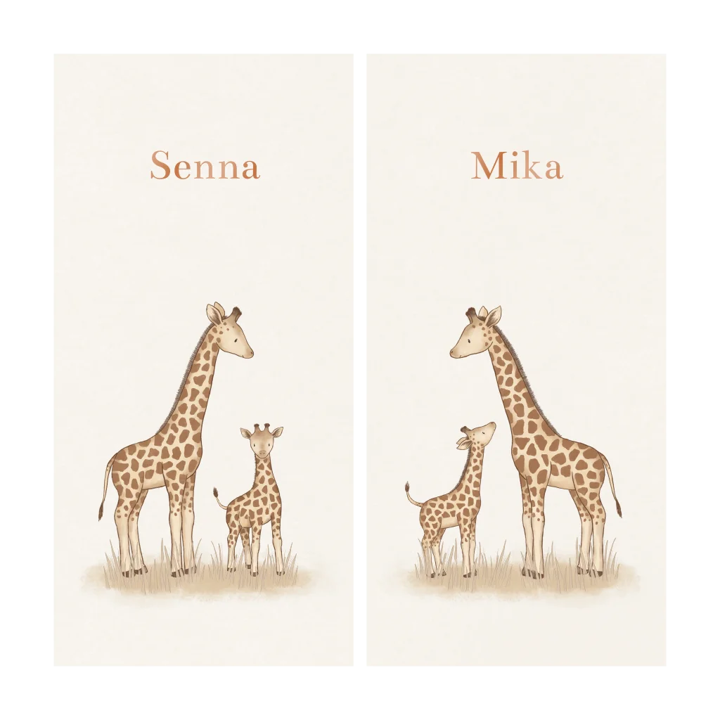 Deze twee kaartjes zijn perfect voor als jullie een tweeling krijgen! Ieder kindje heeft een eigen kaartje, maar de twee kaartjes passen wel bij elkaar. De kaartjes vormen samen een giraffen gezinnetje. De namen zijn in een koperkleurige hoogglans.