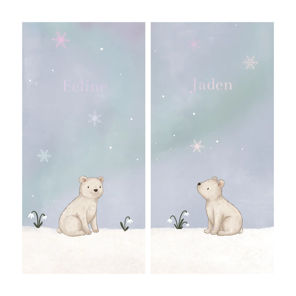 Deze twee kaartjes zijn perfect voor als jullie een tweeling in de winter verwachten! Ieder kindje heeft een eigen kaartje, maar de twee kaartjes passen wel bij elkaar. Op de kaartjes staan twee lieve illustraties van ijsbeertjes in de sneeuw tussen de sneeuwklokjes. De namen en sneeuwvlokjes zijn afgewerkt in schitterend holografisch folie. Pas het ontwerp eenvoudig aan in de online editor.