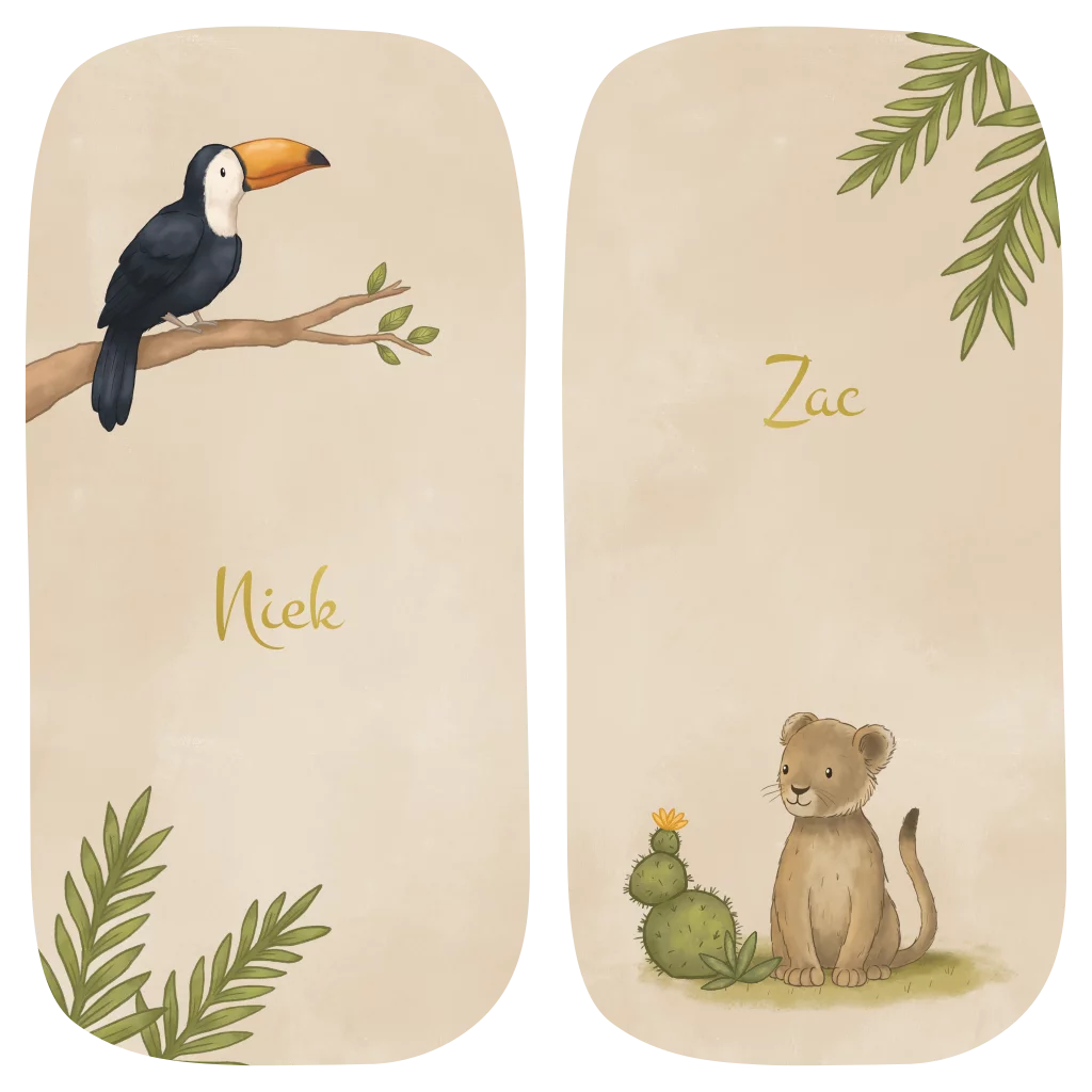 Twee losse geboortekaartjes in een speels rechthoek vorm, perfect voor jullie tweeling. Zo heeft ieder kindje een eigen kaartje, maar passen ze wel bij elkaar. Op de kaartjes staan een leeuwtje en een toekan in de jungle. De beige achtergrond zorgt voor een rustige warme uitstraling.