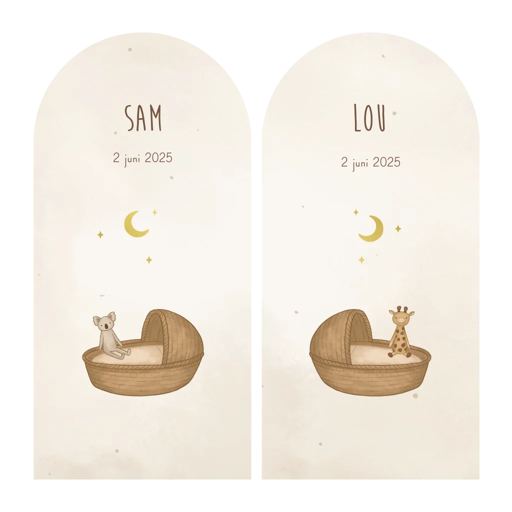 Deze twee losse boogvorm kaartjes zijn perfect voor als jullie een tweeling krijgen. Ieder kindje heeft een eigen uniek kaartje, maar de twee kaartjes passen wel bij elkaar. Op beide kaartjes staat een schattig wiegje met ieder een eigen knuffeltje, de ene een koala en de ander een girafje. Makkelijk aan te passen in de editor! Neem contact met ons op als je een illustratie op maat wil, bijvoorbeeld een ander knuffeltje, die niet in de editor staat.