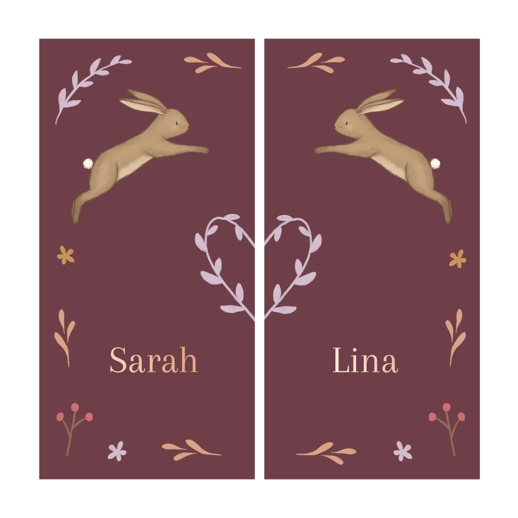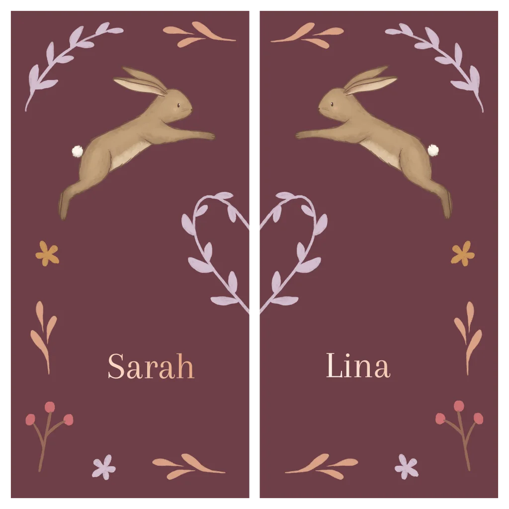 Twee geboortekaartjes die in elkaar passen voor een tweeling. Zo heeft ieder kindje een eigen kaartje. Folkore illustratie met konijntjes. De namen zijn in roségoudfolie voor een twinkelend effect!