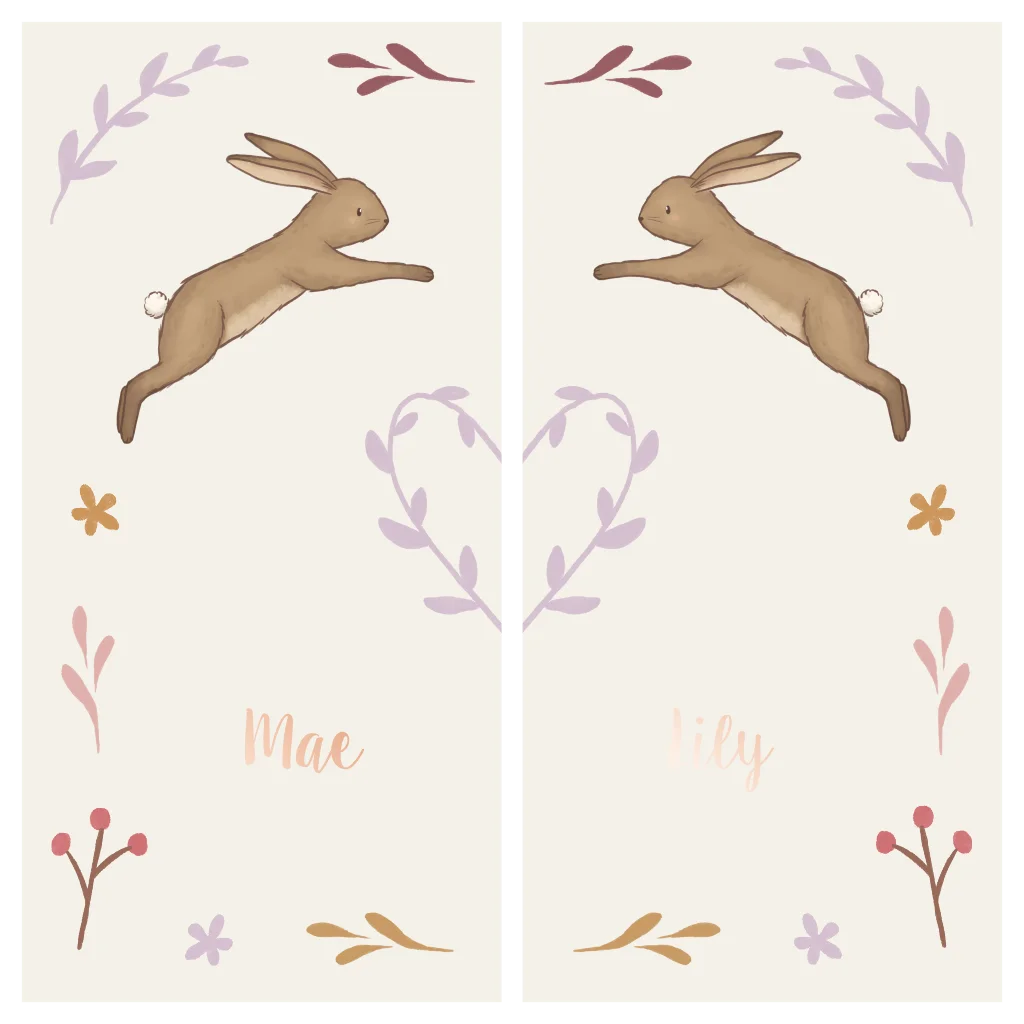 Twee losse geboortekaartjes die bij elkaar aansluiten doormiddel van een hartje van blaadjes. De twee springende konijntjes geven de kaartjes een lieve uitstraling. Perfect voor jullie tweeling!