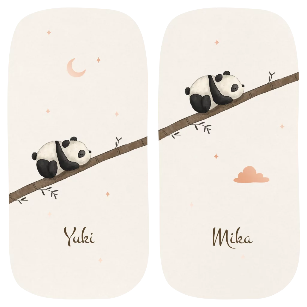 Twee losse geboortekaartjes voor een tweeling. Ieder kindje heeft zo z'n eigen kaartjes, maar doordat de bamboe tak doorloopt over beide kaartjes passen ze bij elkaar. De lieve baby panda's liggen lekker te slapen. Het maantje, wolkje en sterretjes zijn afgewerkt met roségoudfolie.