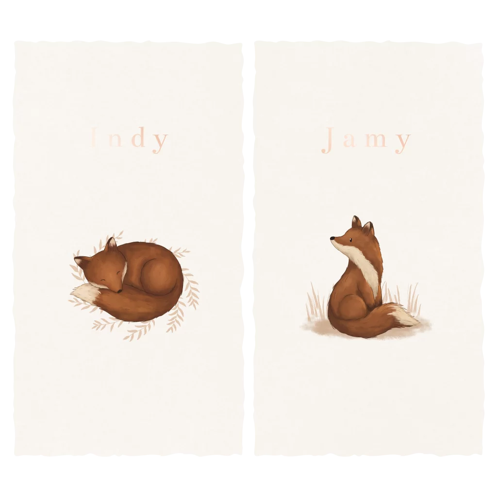 Deze twee kaartjes zijn perfect voor als jullie een tweeling krijgen! Ieder kindje heeft een eigen kaartje, maar de twee kaartjes passen wel bij elkaar. Op de kaartjes staan twee lieve illustraties van vosjes. De namen zijn afgewerkt in schitterende roségoudfolie. De geboortekaartjes hebben een kartelrand wat een geschept papier look geeft. Kies voor de papiersoort linnen, voor een extra handgeschept papier uitstraling!