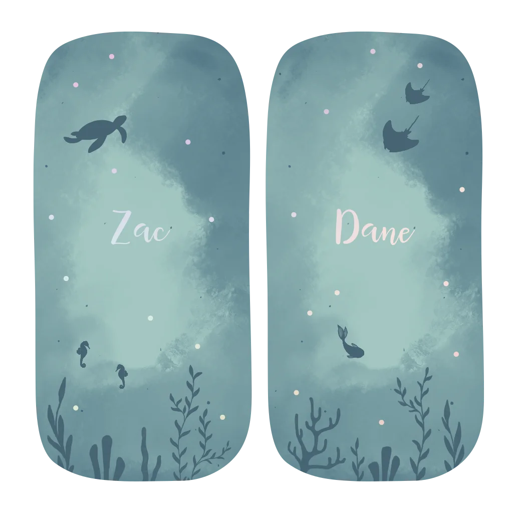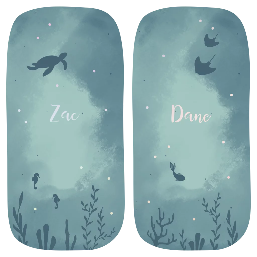 Twee losse geboortekaartjes in een speels rechthoek vorm, perfect voor jullie tweeling. Zo heeft ieder kindje een eigen kaartje, maar passen ze wel bij elkaar. Op de kaartjes is een onderwaterwereld te zien met zeedieren. De namen en stipjes zijn in holografisch folie.