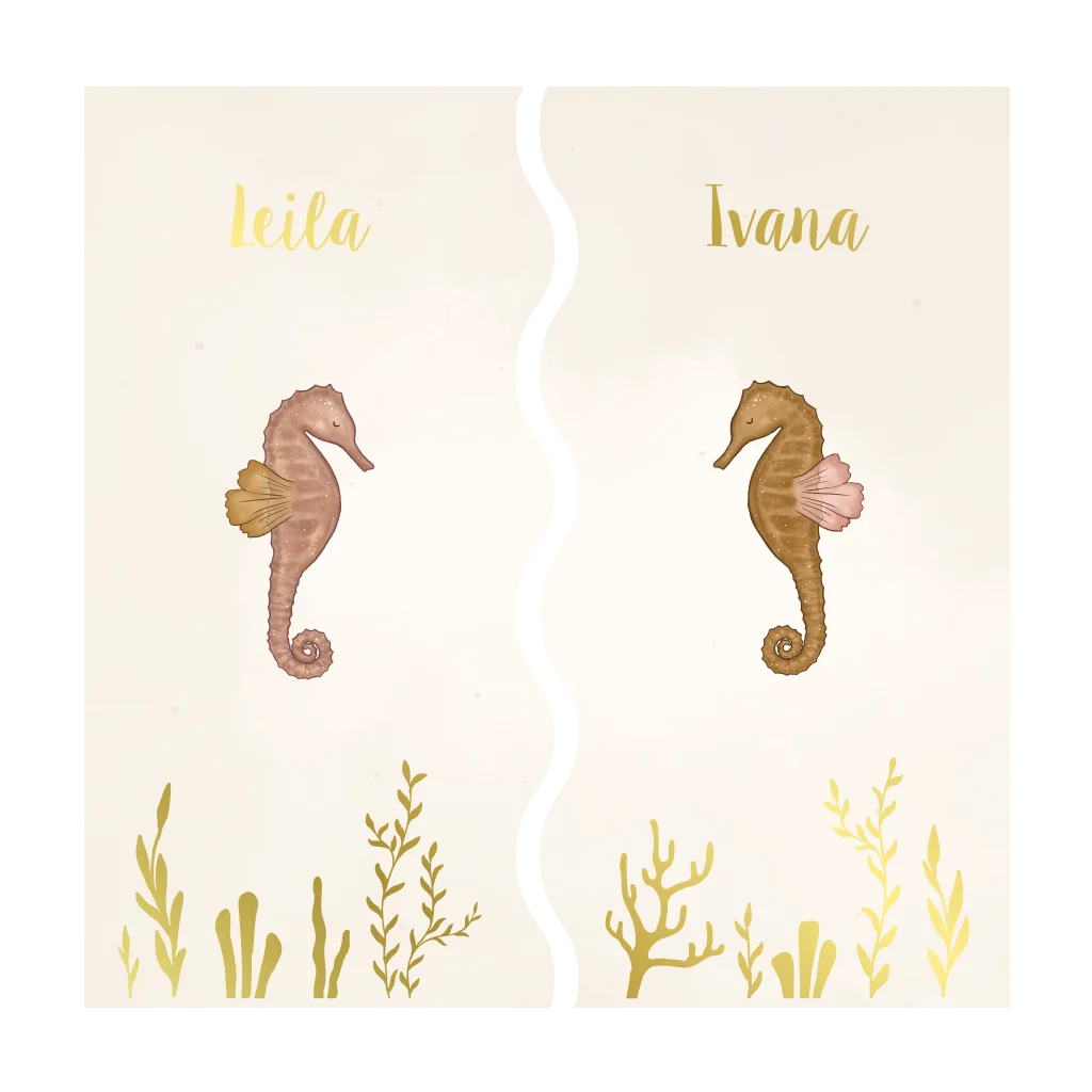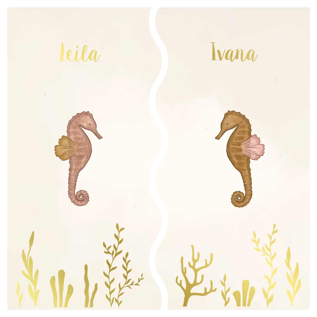 Deze twee losse kaartjes passen in elkaar door de golvende stans-lijn, perfect voor een tweeling! De geboortekaartjes hebben ieder een lief zeepaardje in een eigen kleur en het koraal is afgewerkt met goudfolie.
