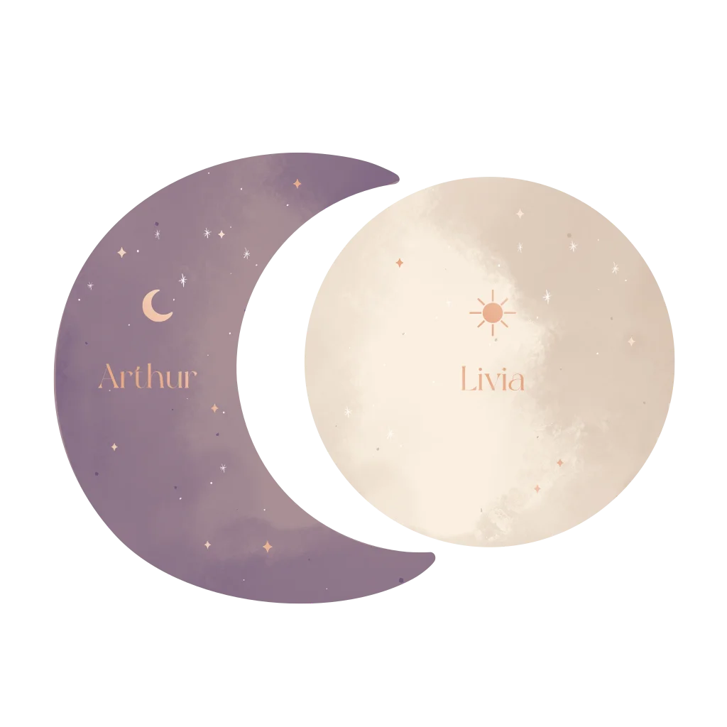 Kondig de geboorte van jullie tweeling aan met deze prachtige, magische kaartjes. De twee kaartjes in een vorm van een zon en maan passen perfect bij elkaar. Zo heeft ieder kindje een eigen kaartje. Pas de kleuren eenvoudig aan in de editor!